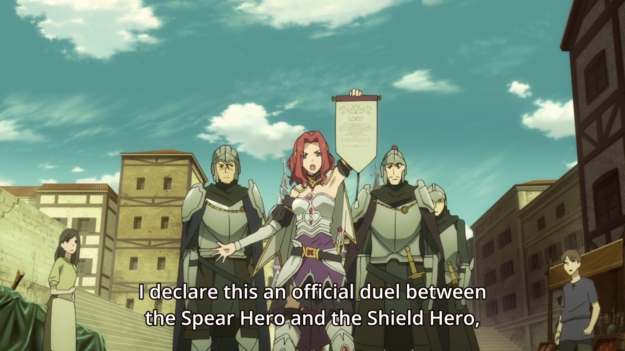 — So despite being a hero, Spear Jerk picks a fight with Naofumi in the middle of the city where there are innocent bystanders. The guy chasing after Naofumi finally catches up and tries to break up the fight, but of course, here comes the one-dimensional villainess to stir up trouble for no good reason.