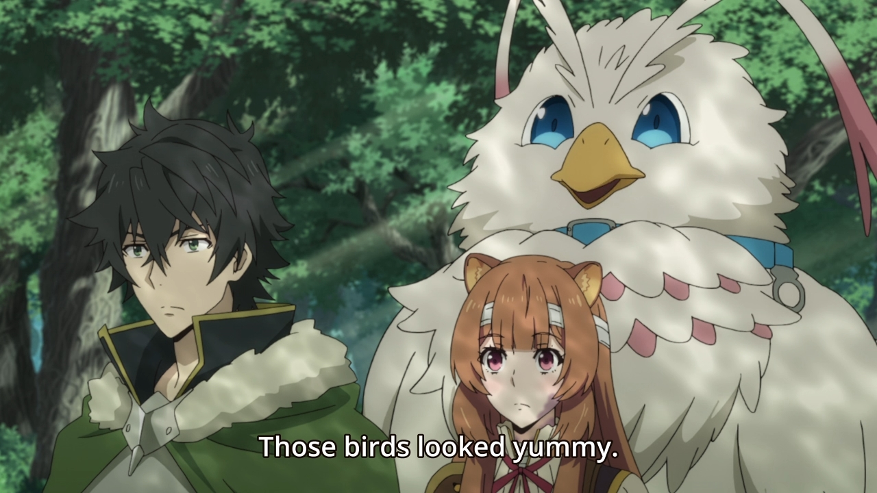 — Anyways, after Naofumi takes care of some extra stuff back at the village, Melty proceeds to ask him for help. Apparently, she got separated from her guards, because she got distracted by birds. How does that work? I mean, how far did she run away from her guards? How incompetent are they that they ended up losing sight of her? How further incompetent are they that they’ve seemingly stopped looking for Melty because she’s now asking for Naofumi’s help? Considering how she’s likely related to Malty and thus a princess in her own right, you’d think she could afford to surround herself with some talent.