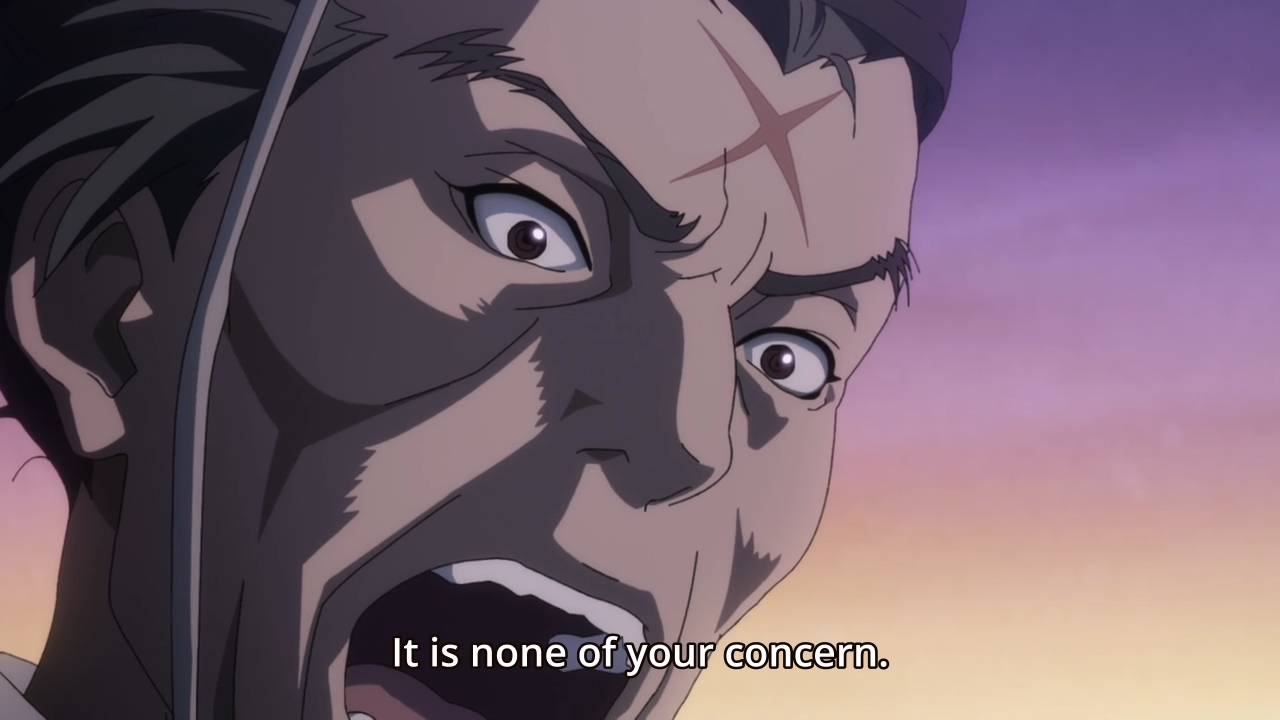— Tahomaru proceeds to deliver a proud mini-speech about how this land used to suffer greatly until his father showed up and turned everything all around. The irony is delicious, because the old man only managed that by sacrificing his own kin. You gotta wonder how Tahomaru will react when he learns the truth. Will his worldview completely shatter? Will he turn against his father? Or will he try and protect the family and go after Hyakkimaru?
