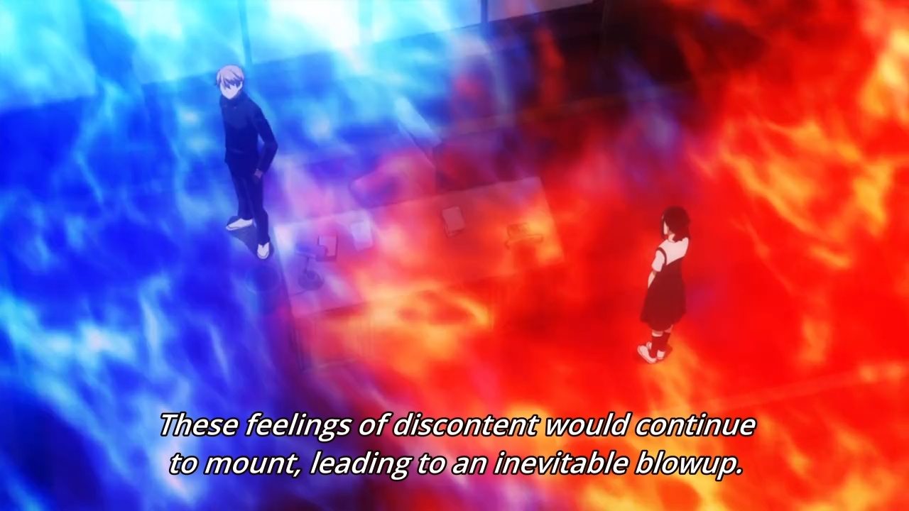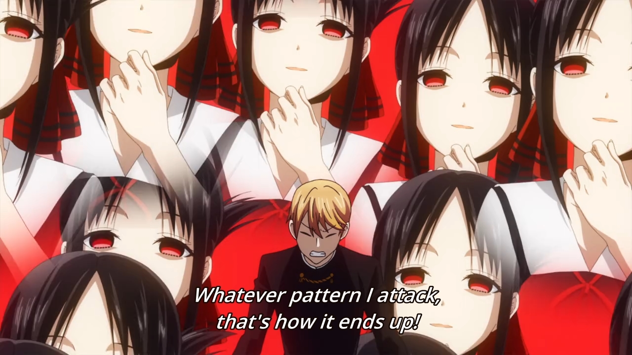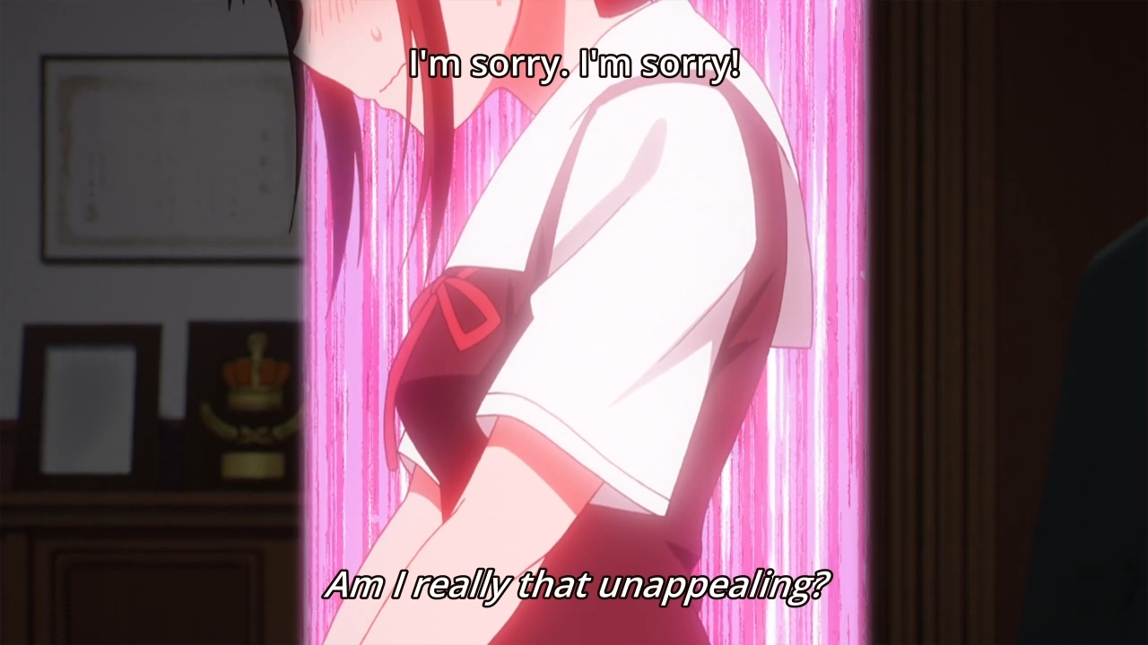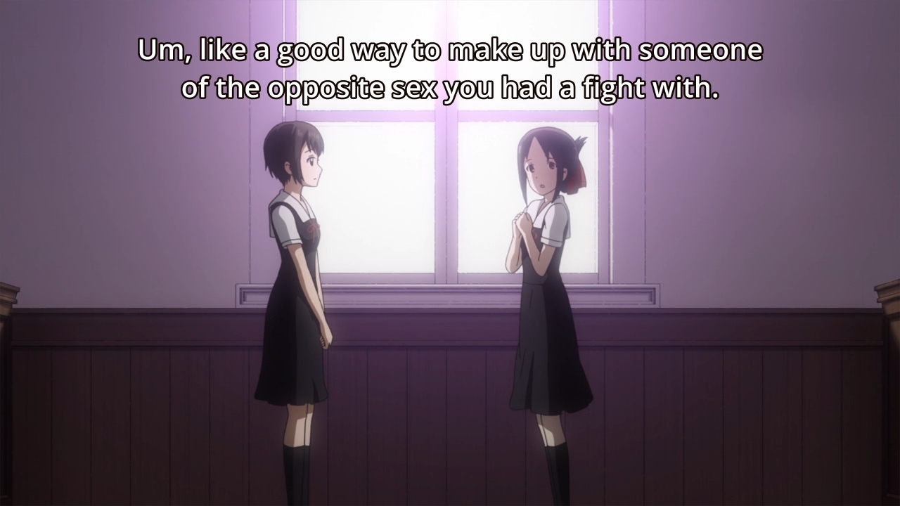 In the second third of the episode, Kaguya confides in Nagisa about the lingering awkwardness that still remains between her and Miyuki. Speaking of Nagisa, she and her boyfriend are kinda like foils for the main couple. If you want progress, look at those two. If you want frustrating, stuck-in-the-mud faux drama, look no further than Kaguya and Miyuki. Anyways, just revisit the first paragraph of this post to get a gist of Kaguya’s frustrations. On the other side of the campus, we see Miyuki confiding in Yu instead of Nagisa’s boyfriend (do we even know his name?), and I have to admit that the first-year actually manages to steal the show with his rant. In the end, however, talking to Yu helps Miyuki sort out his feelings. And in doing so, this spurs him to admit his guilt to Kaguya. Apparently, he did touch her when they shared her bed. Obviously, this is your typical anime, so our hero can’t be too bold. Yo, this ain’t Domestic Girlfriend, alright? Ain’t no hormonal teenagers banging anyone here. As a result, the guy confesses to merely touching her lips once with his fingers. Hell, I don’t even remember this happening because it sounds like such a non-issue. Nevertheless, his confession is enough to satisfy Kaguya, so they’re back to normal. Unfortunately. In other words, let’s maintain the status quo forever.