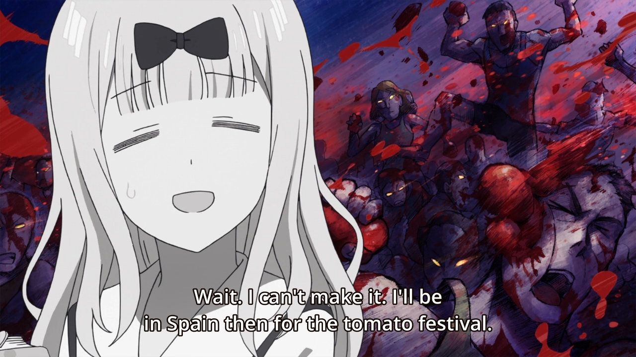 Sure enough, the last third of the episode feels as though no progress has been made. I dunno, maybe 5 cm at best. Basically, summer vacation is coming up, and Miyuki obviously wants to spend some time with Kaguya. They had this discussion episodes ago, but they never really agreed to anything. And like usual, he’s too chickenshit to just ask her out directly. According to that big brain of his, any move he makes would just result in Kaguya looking down on him. Well fuck, if he thinks that poorly of her, why does he even like her in the first place? Clearly, I’m losing a bit of patience with the characters even though this is only supposed to be an inconsequential romcom that isn’t meant to go anywhere (despite all those lofty claims I heard). Honestly, the show’s just not funny enough to justify its monotony. And yes, I think the show is getting monotonous. I think the show isn’t very dynamic. It’s the same jokes week in and week out, and since nothing ever changes, it quickly becomes boring. Even after “everything” that happened between Kaguya and Miyuki in the past two episodes, it just amounted to the two of them returning everything back to normal. Yawn.