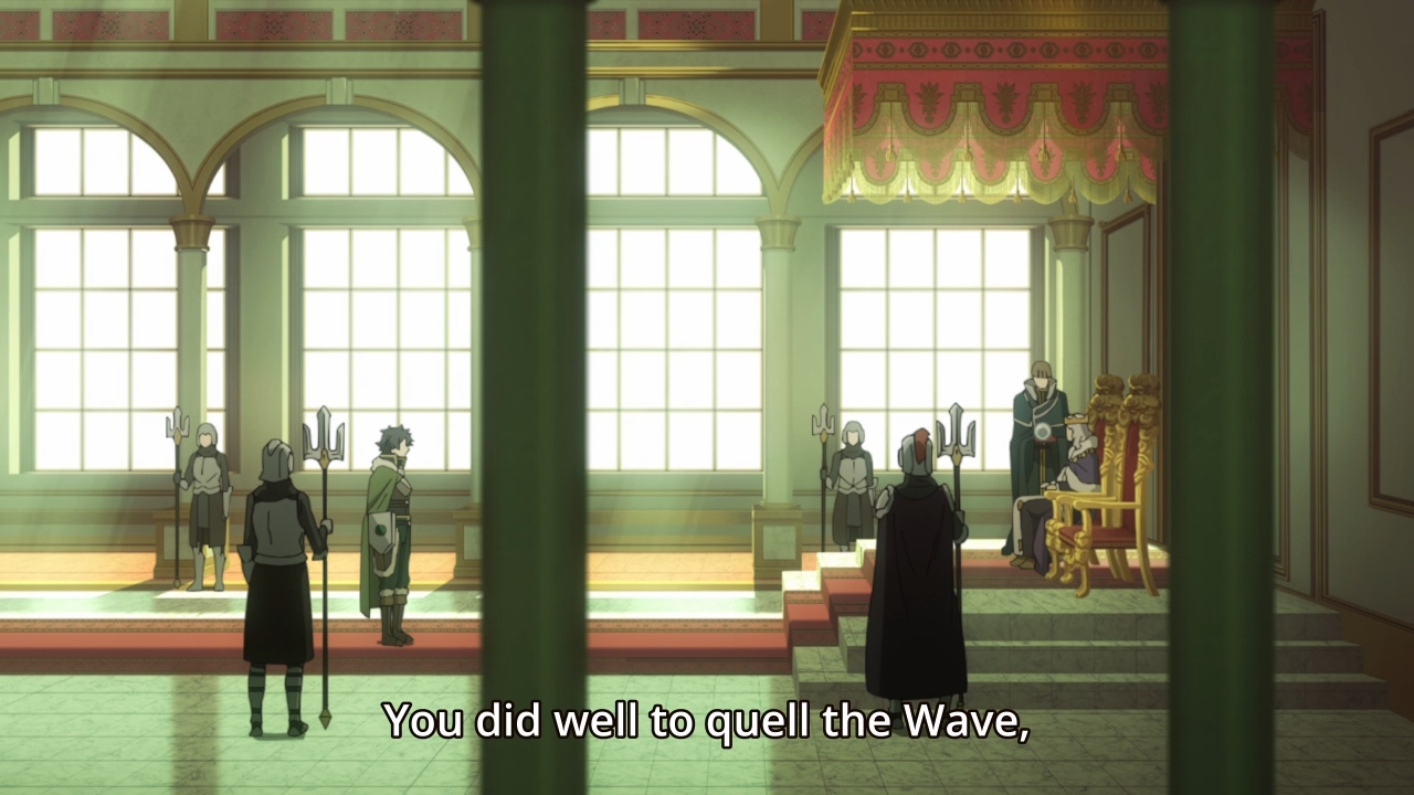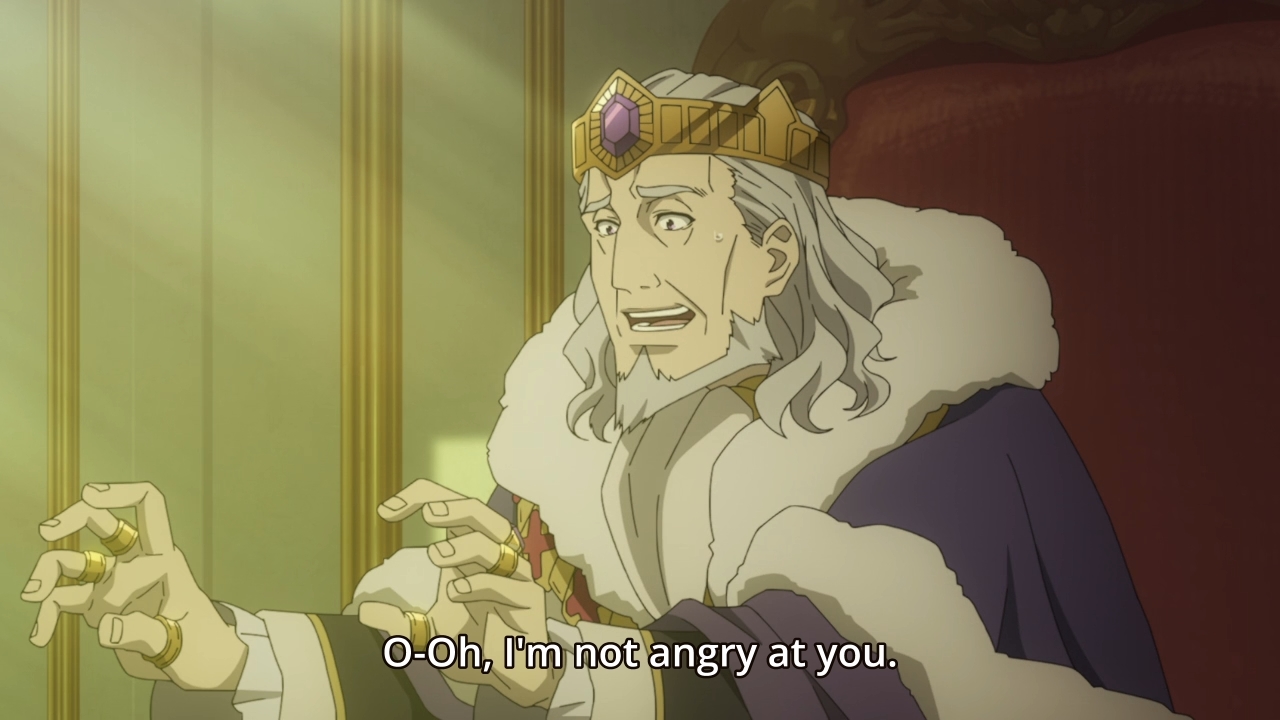 — He then gets dragged into a meeting with the bastard king. At first, the old man lightly praises him, but he quickly goes back to spewing nothing but bullshit. Specifically, he gets on Naofumi’s case for using powers that are “unbecoming.” Uh-huh, whatever that means.