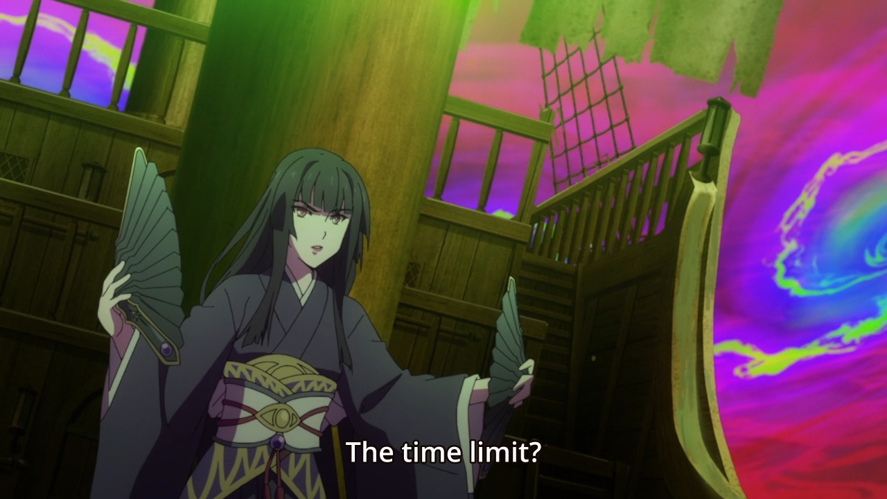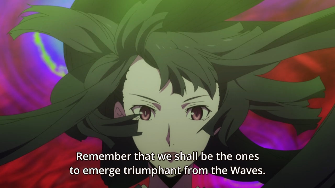— Oh no, Glass is so strong! How are our heroes going to get out of this mess! Surprise, surprise, she is out of time. The Wave is about to end in a minute, so Naofumi just hightails it outta there with his girls. Unable to hurt him from long range, Glass has no choice but to retreat to wherever she originally came from. Yawn.