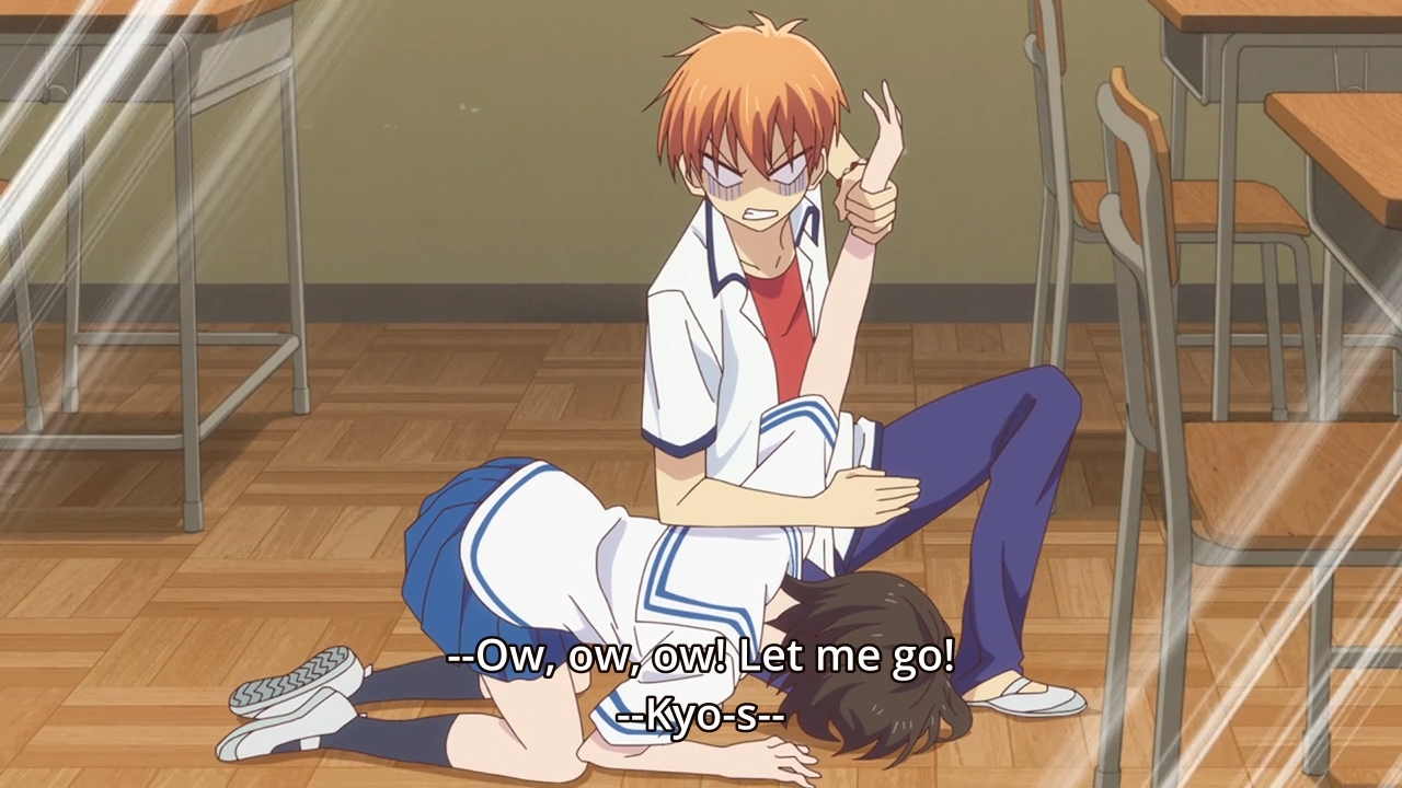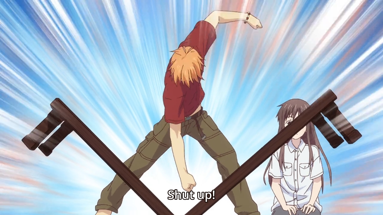 — When it seems like yet another fight might break out, Tohru does the only thing she can do: give out hugs. She’s such an airhead. Not only that, we’ve seen Yuki backhand and kick Kyo around without any repercussions. But all of a sudden, our girl decides to jump into action here. Shrug.