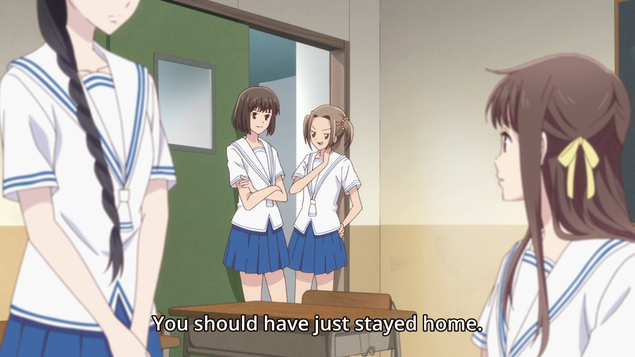 — Thanks to all the morning shenanigans, both Tohru and Yuki are late to school. This, of course, invites gossip and suspicion from all the other girls. Look, I don’t want to hear any sass from someone with that face.