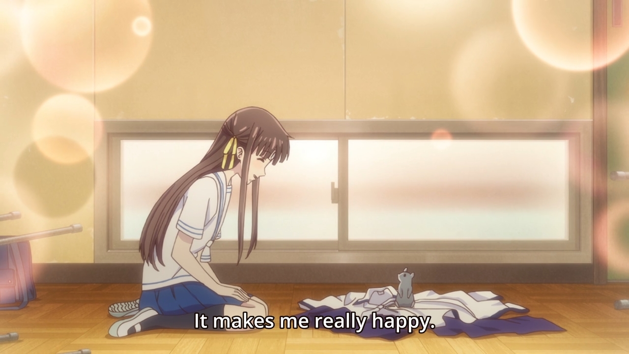 — Kyo apologizes and our heroine is immediately touched. This one gesture makes up for all of those bad interactions! He’s yelled at her, picked fights with Yuki, broken a table, left a hole in her roof, so on and so forth. But look, this one gesture. When things are good, they’re so good! He seems like an asshole, but you just have to get to know him! And I’m totally addicted to this emotional roller coaster!
