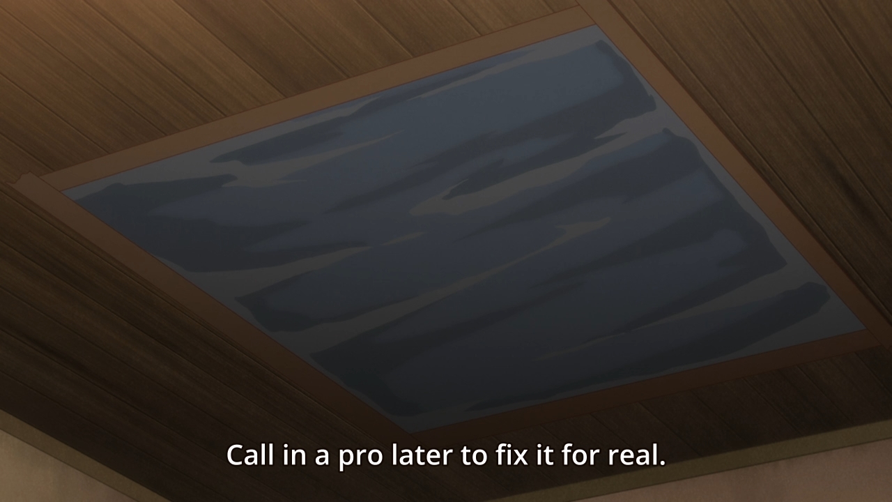 — Later, when Tohru gets back to her room, she finds that Kyo has patched up the hole in the roof. Uh, wouldn’t it get drafty at night? Ah well.