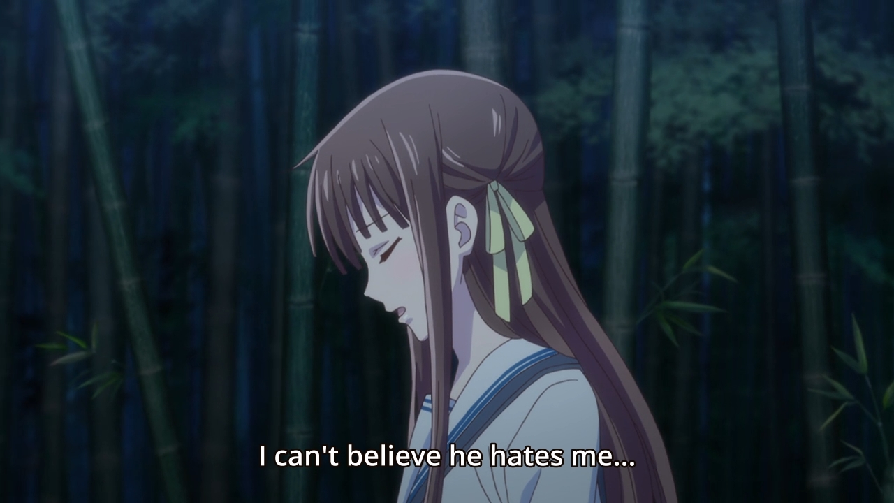 — Now that they’ll be living together and going to the same school, Tohru laments the fact that Kyo seems to hate her. We all know that he doesn’t. We all know that he’s just emotionally stunted, so he can’t express his feelings properly. Nevertheless, our heroine seems like one of those cloying people who can’t stand the idea of anyone disliking them. And sure, it’s admirable to want to befriend everyone. But you have to be careful. You have to make sure you don’t inadvertently set yourself on fire just to keep others warm. Some people just aren’t worth befriending. Some people are just downright toxic.