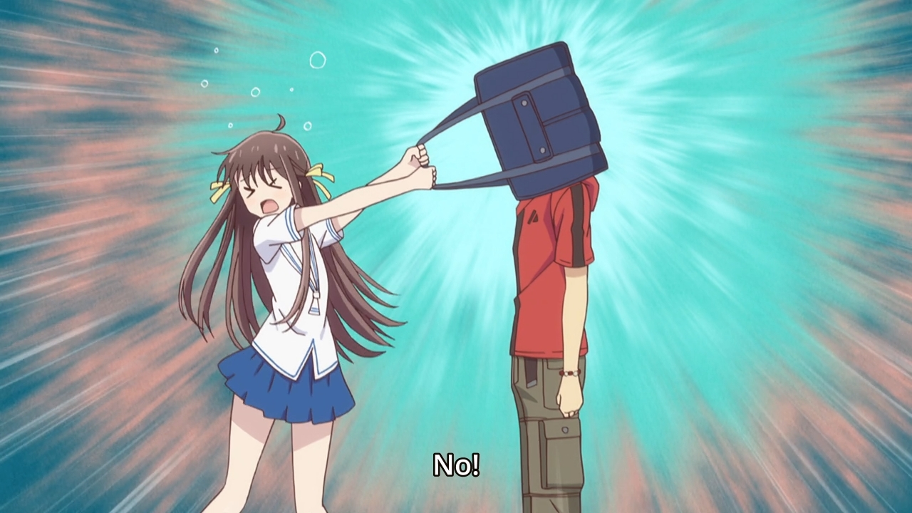 — Eventually, one of the girls get a little too close and personal, so Kyo immediately subdues her. So y’know, this is okay. You just can’t hug a girl. Unfortunately, Tohru only has one move in her arsenal: hugs. Then again, I’m glad that the animators can just retrace the same pose over and over.