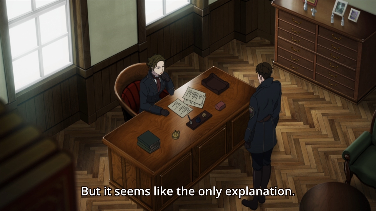 — Back in the present, Free’s superior don’t quite know what to make of the idea that Mariya is somehow fairy-possessed. As a result, she crumples up his original report and tells him to fabricate a new one. Hmm. Like I said, with our lack of information, all we can really do is go hmm. A show like this needs action… to a certain point. I also need to be emotionally invested in these characters, which has yet to occur.