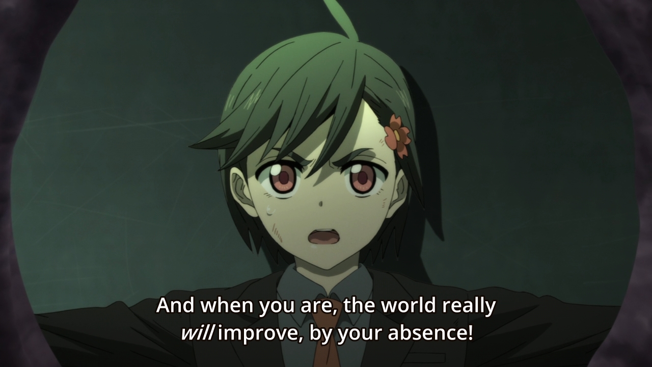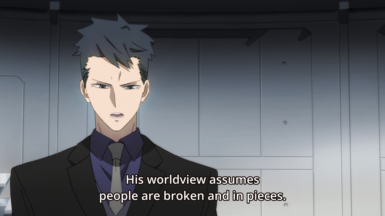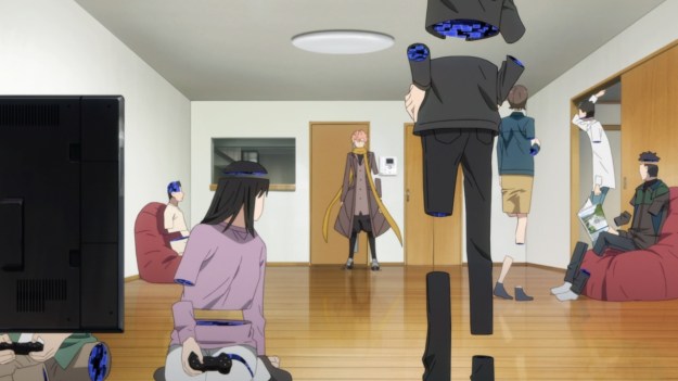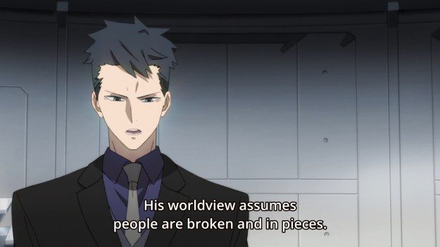 But really, what truly bugs me about the first two episodes of ID INVADED isn’t so much the fantastical nature of its science fiction, but the clumsy way in which information — whether it’s about the technology that allows one to dive into a killer’s id or the killer’s own intent — is relayed to us. As Sakaido pieces together the killer’s fragmented mind, we cut away constantly to the peanut gallery in the real world. Every action he takes is punctuated by these nuggets of clumsy exposition. “The battle lasts until our brilliant detective solves the mystery of [the girl’s] death!” “Id wells are the human unconsciousness!” “Only someone who’s killed can enter a well!” “His worldview assumes people are broken and in pieces.” This bothers me because you have right there a blank canvas for the imagination and I’m not even using a metaphor. Our hero can literally enter a killer’s mind. He’s in one for the majority of the first two episodes, in fact! The story can use this conceit to visually portray any sort of information that it wants to convey to the user — and it does! — but we still have to do our “due diligence” and check in on Sakaido’s handlers. Ooh, what are their reactions? What do they think? I’m reminded of those Japanese variety shows where it’s not enough for me to see some gag play out on screen. I gotta know how these famous people on the side are reacting. Are they laughing too? I don’t want to laugh if they’re not laughing!