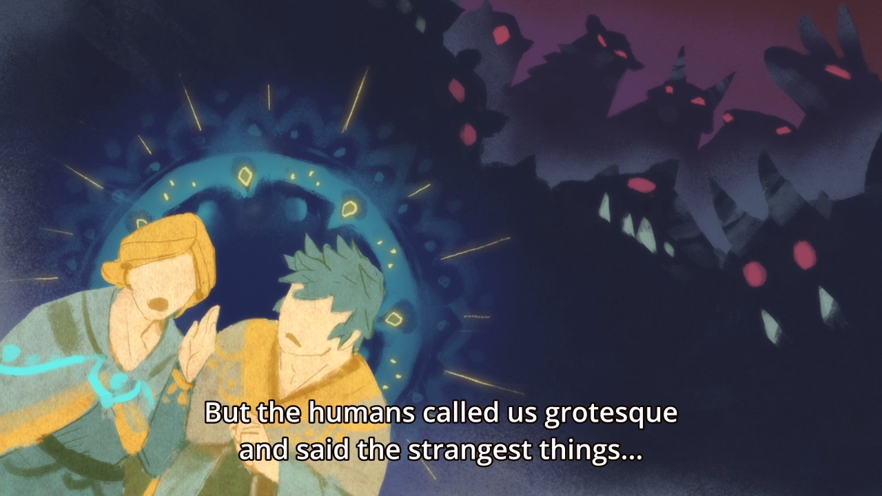 One day, a golem strolls through a forest and stumbles upon a human girl in chains. Somali immediately attaches herself emotionally to the golem and refers to it as her father (for the sake of brevity, I may as well use male pronouns from here on out). Even though his original task is to watch over the forest, he takes the girl and they embark on a trip to find her parents. Failing that, just meeting any human would suffice. He repeatedly informs the little girl that he can’t understand emotions, so at first glance, it would seem that he is ill-equipped to care for a young child. But this sort of pairing is nothing new. On the one hand, we have a young, rambunctious child full of vim and vigor; she’s brimming with childish exuberance. This unpredictability will likely serve as one of the many ways to introduce conflict to the story. In this episode alone, Somali’s curiosity leads her away from the safety of her father’s gaze. A talking cat might have eaten her had the golem not quickly appeared by her side. He thus represents the stern, paternal figure who values practicality and pragmatism; he does so seemingly because that’s all he can do. It is in his programming. At times, the golem almost appears as though he’s executing a set of instructions. The word “golem” suggests magic. It conjures up the notion of witches or warlocks taking a lump of inanimate material and somehow enchanting it with life. But from a certain point of view, you could look at a computer chip and make the same observation. We’ve taken a rock and zapped it with electricity. Somehow, the rock can now perform calculations and do so much better than us. So perhaps our father being a golem is apropos in more ways than one. He has life, but his life is incomplete. In caring for Somali, this gargantuan task will inadvertently imbue him with the feeling of love that is missing. We’re already making progress by the end of the first episode when he decides that they should hold hands in order to help keep her by his side. An obvious “aww” moment if nothing else. Just listen to the music swell.