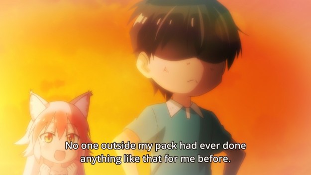 This is the point where I had to pause the anime and laugh and laugh and laugh. A while ago, I remember seeing a trailer for a film about a hunter-gatherer kid being separated from his “pack,” one might say. He eventually befriends a wolf and (I can only assume) through their trials and tribulations, the wolf becomes the very first domesticated animal. Unfortunately, I didn’t get to watch the movie while it was in theaters. But here we have the next best thing! But anyways, back to the story… MC-kun protected her from a bunch of murderous bears, so ever since then, lone wolfu has wanted to create a pack of ALL animals. Y’see, animals are speciest, but MC-kun’s kindness rubbed Ranka the right way.