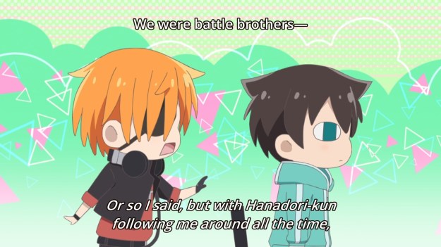I think the longer a title is, the greater the chances that the show will suck. Case in point, I gave this anime exactly nine minutes and thirty-seven seconds. It’s about some chuunibyou, and I can’t ever remember enjoying a show about these delusional kids. I don’t find them remotely funny or interesting. It’s just a tired exercise of one wacky kid plus one serious kid playing the straight man, i.e. rambling on and on about how totally fed up he is about the wacky kid. A while back, there was that Kyoto Animation anime with their patented high production values and moe girls, but even then, I wasn’t interested. It even had romance, and it couldn’t win me over. So what chance does this show have? Absolutely nothing. Zilch. Nada. Zero.