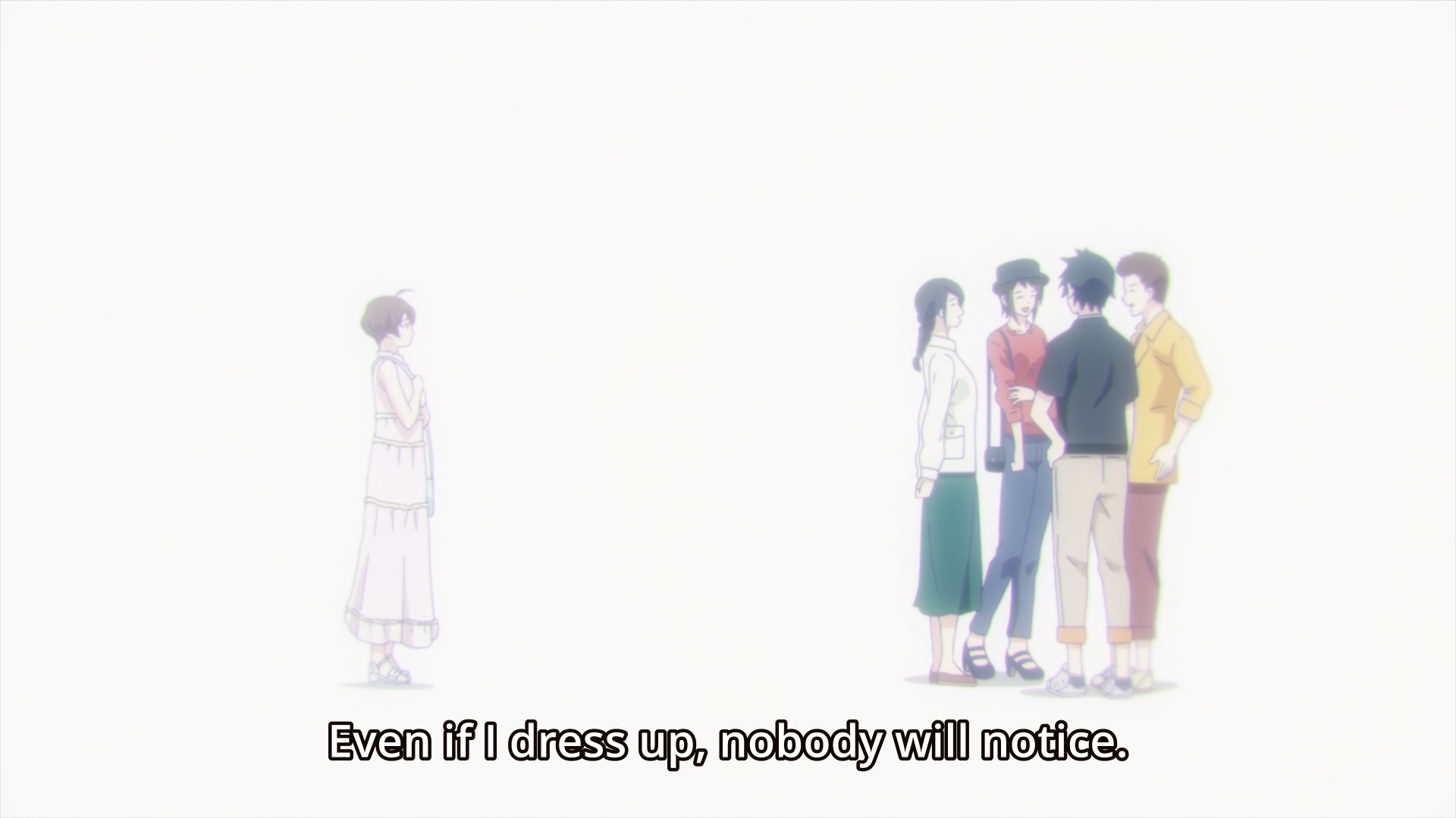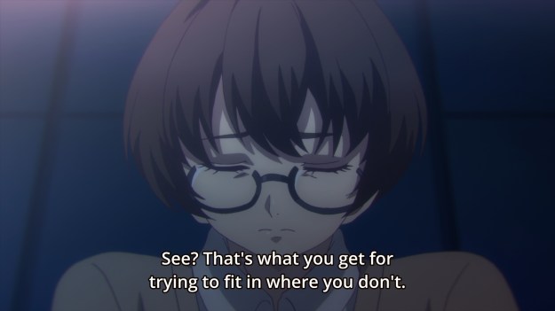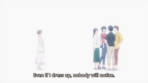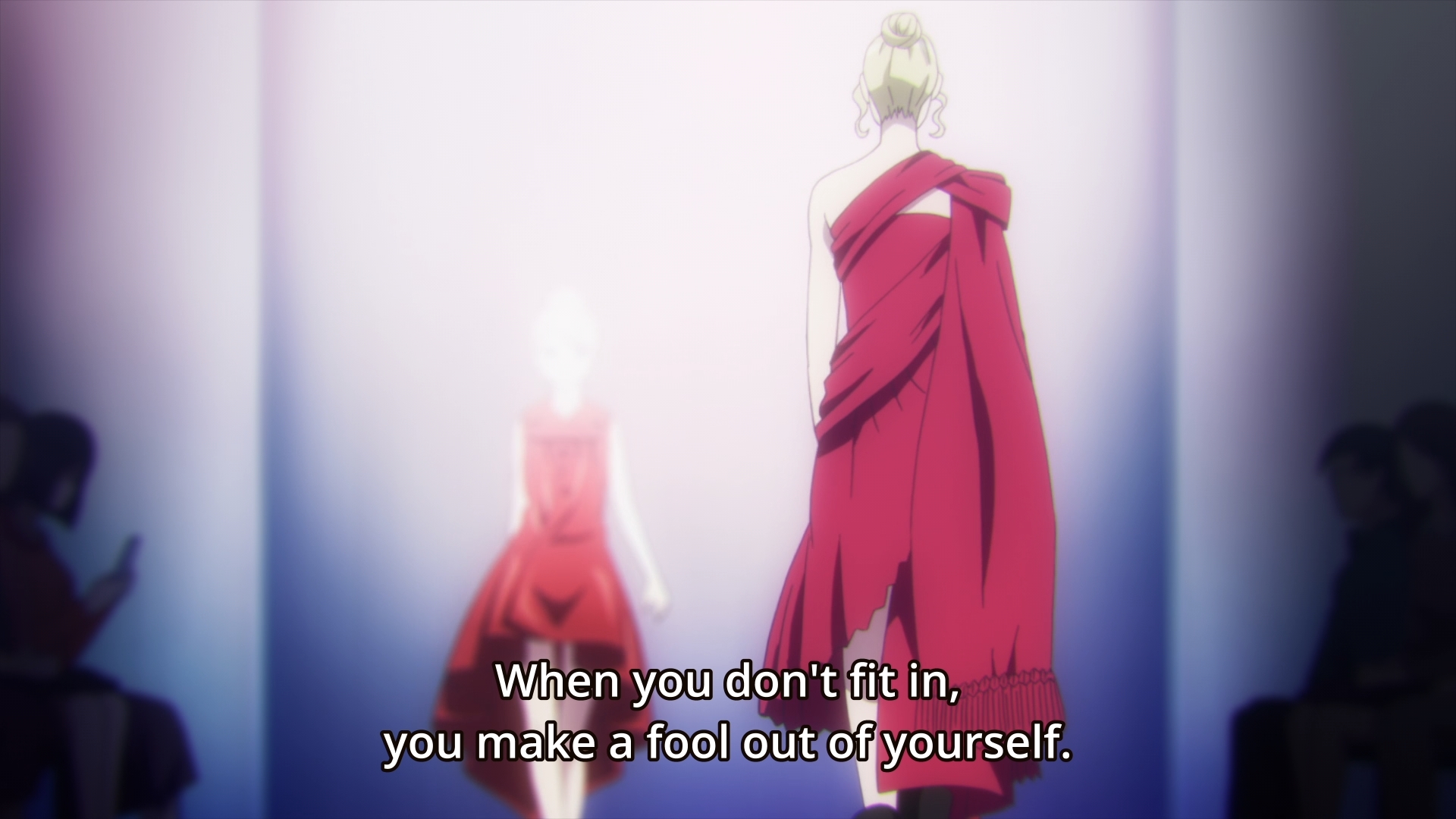 — Our nerdy journalist feels like a fish out of water. This fashion show simply reinforces the idea that there’s an entire world that is shut off from women like her — women who don’t fit the ideal model aesthetic. A bit dramatic, but this anime is kinda like that…