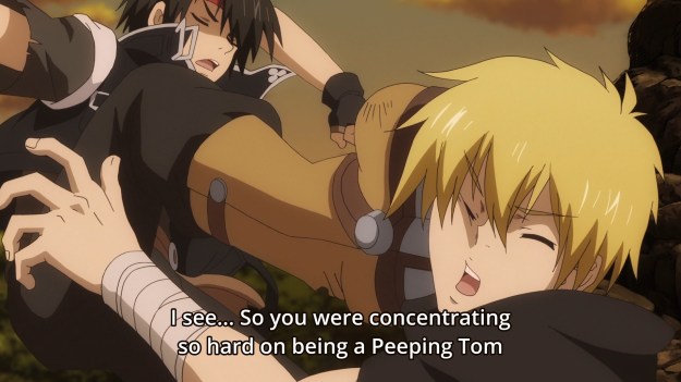 — Like in a shounen, Orphen tells Claiomh to go away because girls don’t get to have fun.  On the other hand, she claims to have been trained to fight, but she fell on her ass just moments ago.