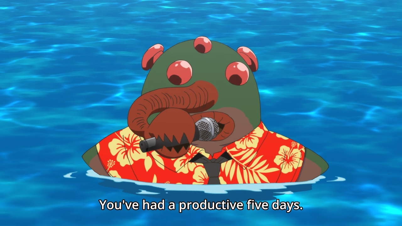 — The beluga sings terrible via her throat, but when Jin finally tells her that she should sing using the protruding “melon” in her head (which you can’t see in the anime because it would make the character not hot), it blows everyone away. But how is it that a beluga whale doesn’t know how to sing without a different species telling how how to do so? Shrug.