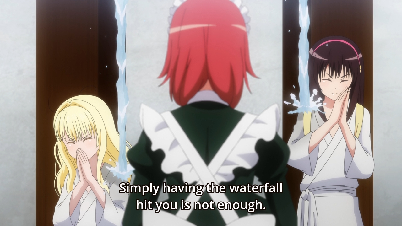 — Ema even has the brilliant idea of pouring water on these two girls in order to facilitate their training. Misogi involves cleansing the whole body as an act of purification, but as you can see here, only the shoulder is necessary. Plus, it looks like the water simply disappears after hitting the girls’ shoulders. How? Magic!