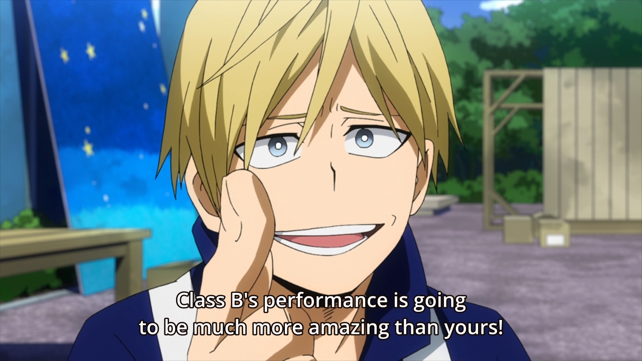 — Deku and Togata proceed to give Eri a tour of the school. Along the way, they bump into a jerk from Class 1-B. There’s always a rival class, and if there’s a school festival, some jerk from the rival class will swear up and down that they’ll defeat our heroes. Like war, anime never changes.