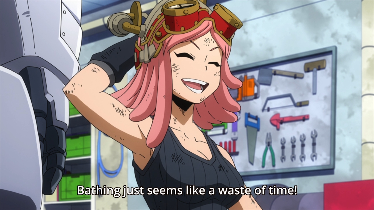 — We eventually pay Mei a visit. I don’t think we’ve seen her in a while. A lot of people wanna ship her and Deku, but I dunno. The obvious reason to doubt this pairing is because, well, she’s obsessed with her “babies.” But for me, this has to be the number one reason to root for some other girl.