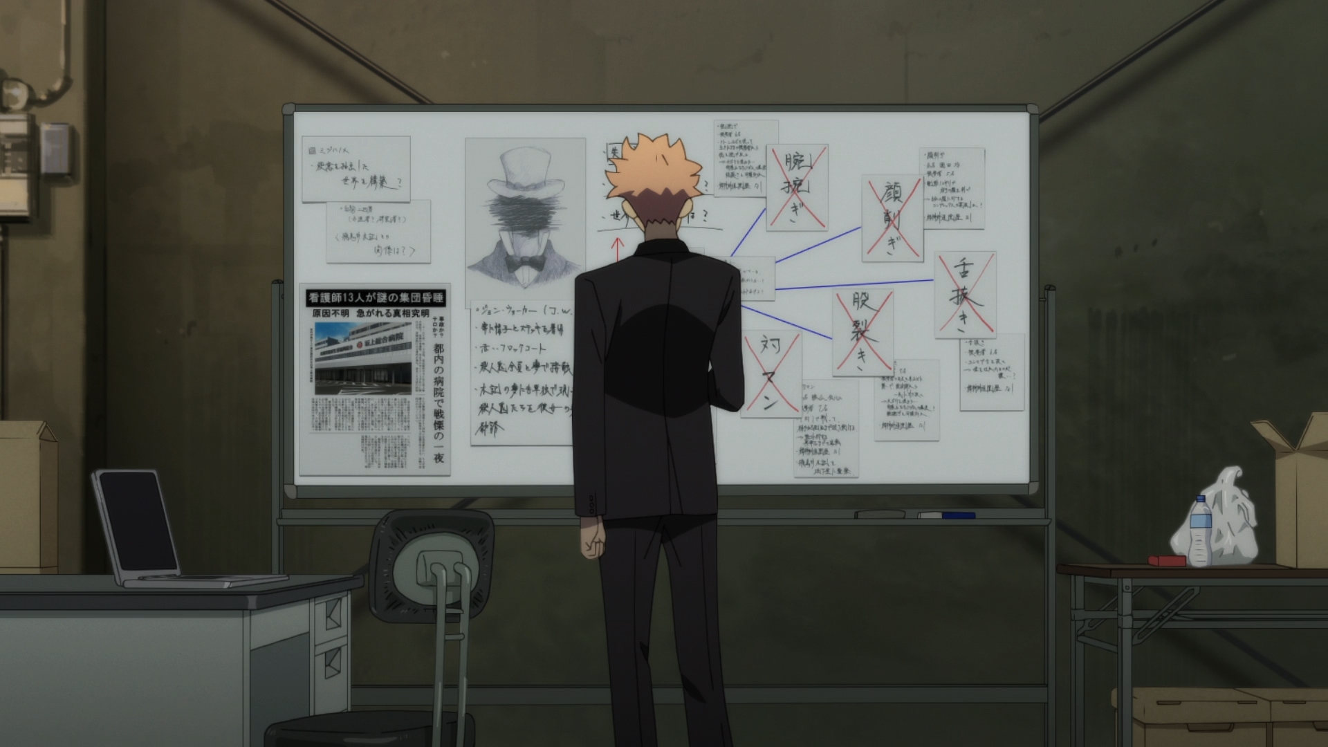 — Despite all the oddities of this world, Narihisago seems content enough. After all, he still has his family. He can still do his job, i.e. hunt down the serial killers. Still, there are two problems. First, we know that none of this is real. This is all just a dream. Narihisago knows that too… at least, I thought he did. The longer that he stays here, the more he will start to believe in this world. Second, he hasn’t really returned to his normal life as the upstanding police officer. He’s still “serial killing” serial killers. Sure, he’s investigating John Walker by hunting down Kiki’s torturers, but Narihisago certainly isn’t wielding the hammer of justice by any means. He’s helping them kill themselves just like in the real world.