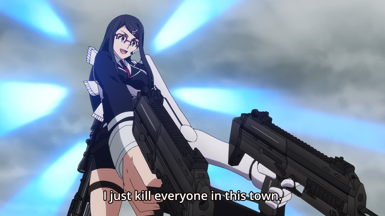— Right! Meet Sonohara, the yandere girl from Licht’s past! Not only does she refer to him as her commander, she’s batshit insane! She immediately plants a bullet in Jail’s chest before turning her attention to the townsfolk… who still haven’t evacuated. What is wrong with you people?