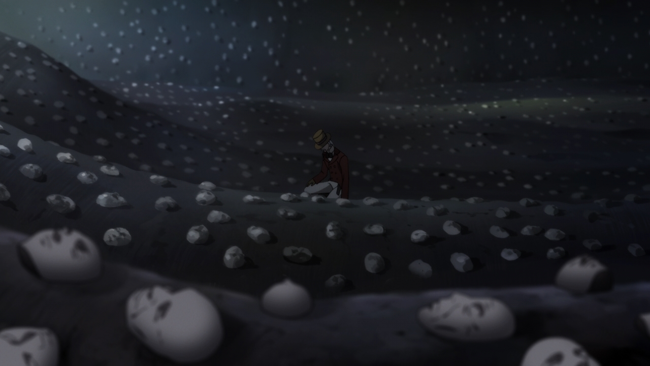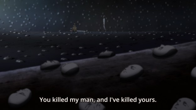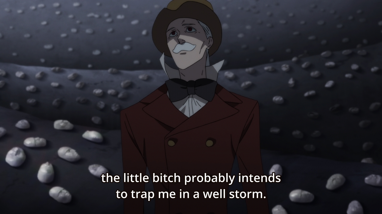 — Narihisago also encounters his own ID Well, remembers who he is, sees his family, then leaves… even though a storm is raging in his unconscious world. Earlier in the series, they went on and on about how a storm would trap you, it’s so terrible, etc. Even Hayaseura is like, “Nuh-uh, Kiki, you can’t trap me! I’m already dead!” But then look at Narihisago and Hondomachi! They’re just waltzing out of their own storms like it’s nothing!