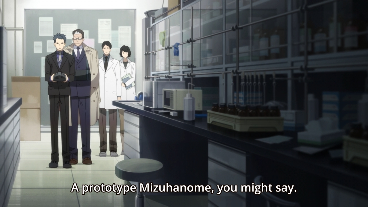 — So how do we stop Asukai when she’s stuck in the middle of a giant Mizuhanome? Momoki says, “The last time this happened, someone was able to get in and take her.” Yeah, you just put on a protective suit along with a prototype Mizuhanome, enter the affected area, and coax the girl into a Mizuhanome… wait, what? Am I mistaken or is this the first time that we’re hearing about this? I don’t remember them saying anything about how the hospital had turned into a Mizuhanome and that they had to extract Asukai. I thought they said she just mysteriously disappeared.