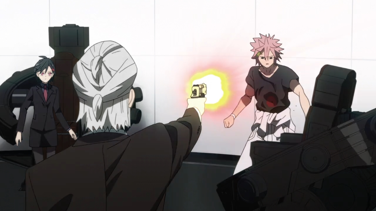 — Back in Hayaseura’s ID Well, Hondomachi and Fukuda talk about his thoughts on the number seven. No, really. This buys us time until Imami shows up. The former Gravedigger then tries to shoot Hondomachi, but Fukuda saves the one again. What’s amusing to me is that she then stays back to avoid interfering. After all, she has to let Hondomachi and Fukuda have their last chat. Isn’t that polite of her?