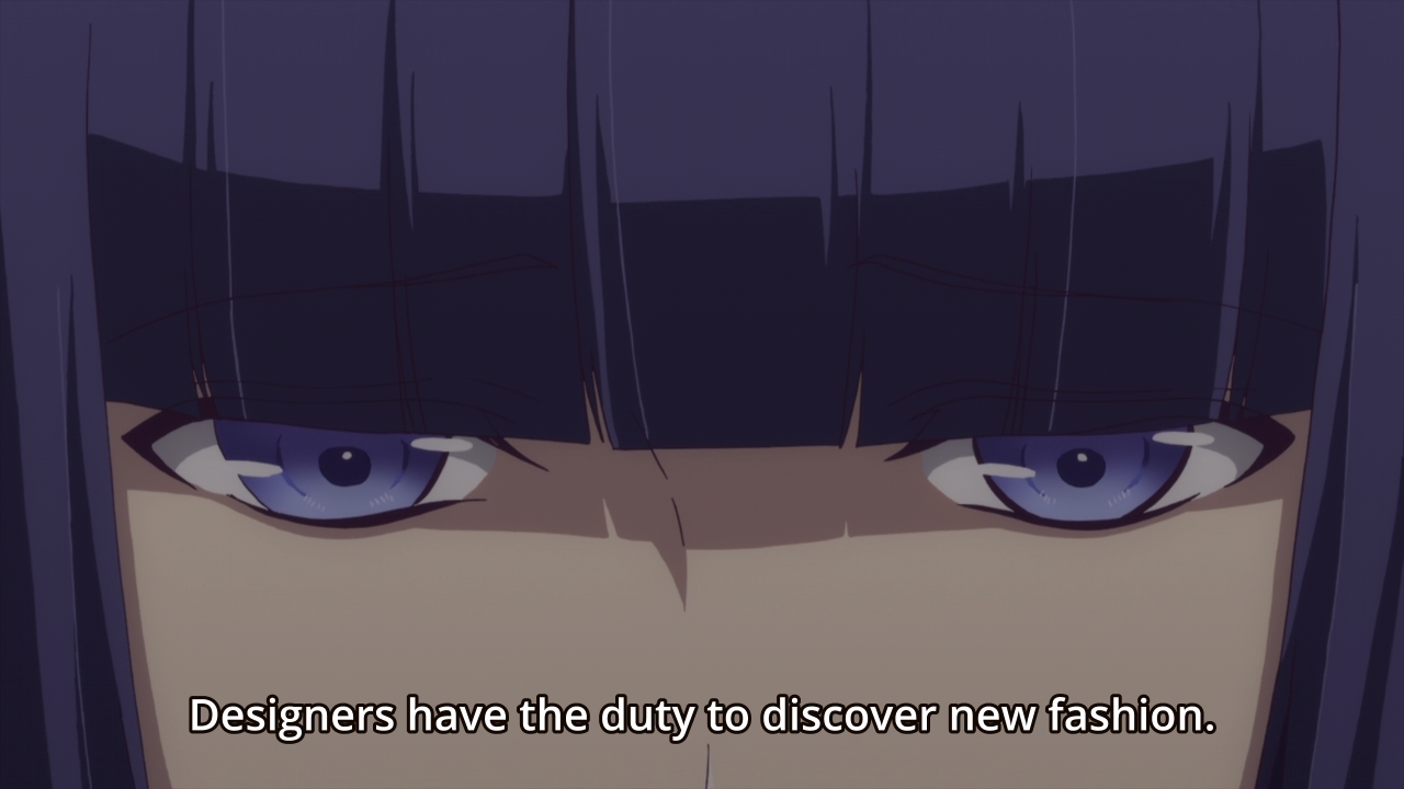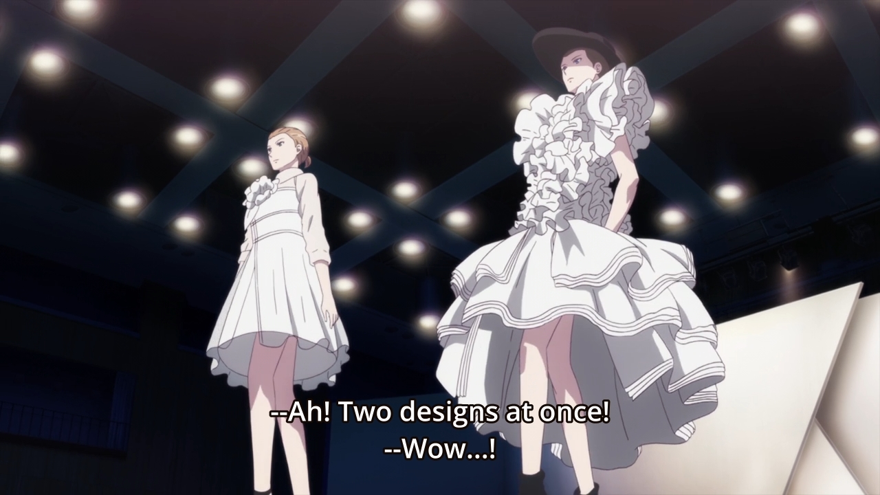 — So Toh’s design philosophy is to juxtapose everyday wear with the avant garde… I guess if you consider this frou frou dress on the right to be haute couture. Look, I don’t know a damn thing. I just know what seems impressive to me, and nothing in this entire series has really wowed me. Then again, I’m the resident anime curmudgeon. I’m always hard to please. It’s just my disposition.
