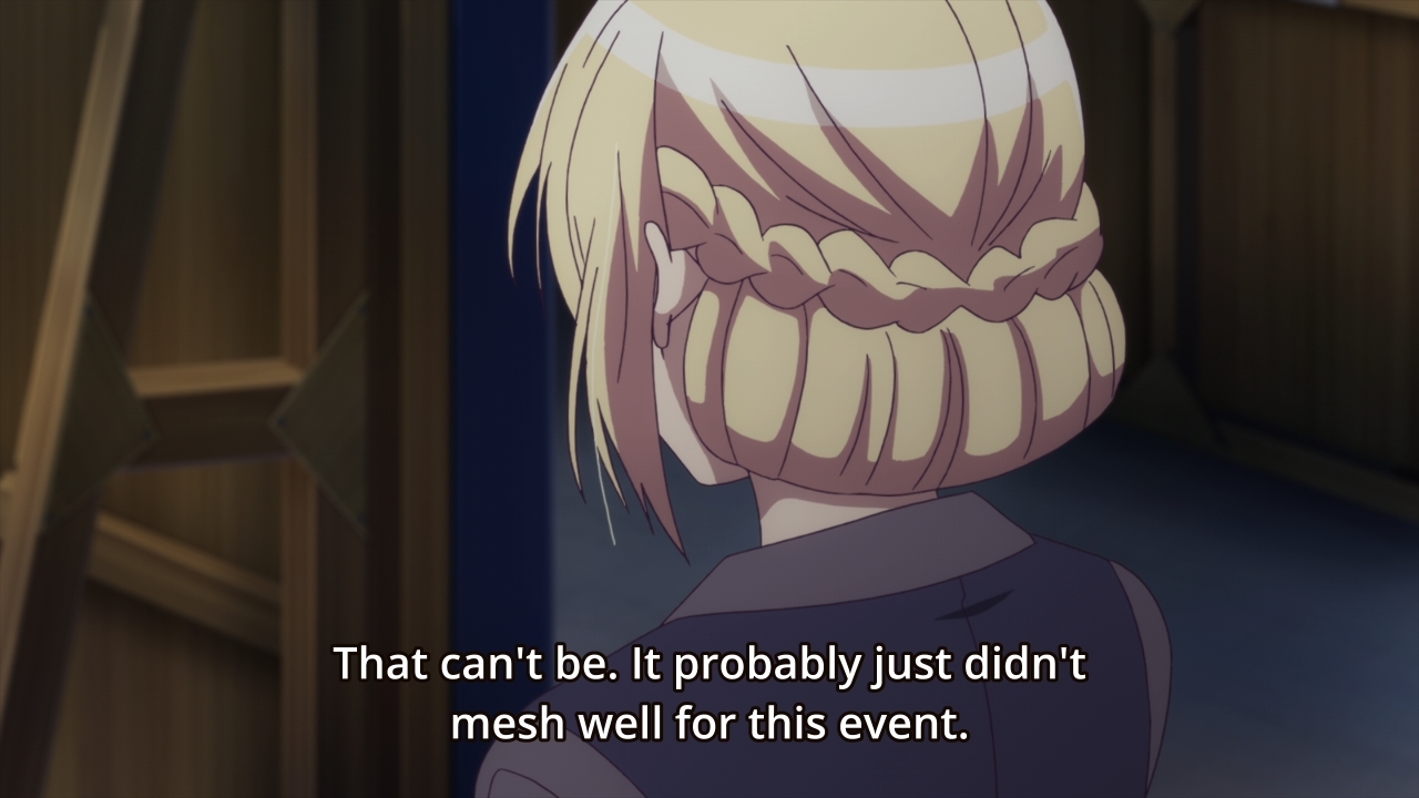 — Chiyuki also shows up to deliver the good news: her efforts today caught someone’s attention, and she’s gotten her first big gig. That’s cool, I guess. Nevertheless, her main goal here is to pick Ikuto up and encourage him along.