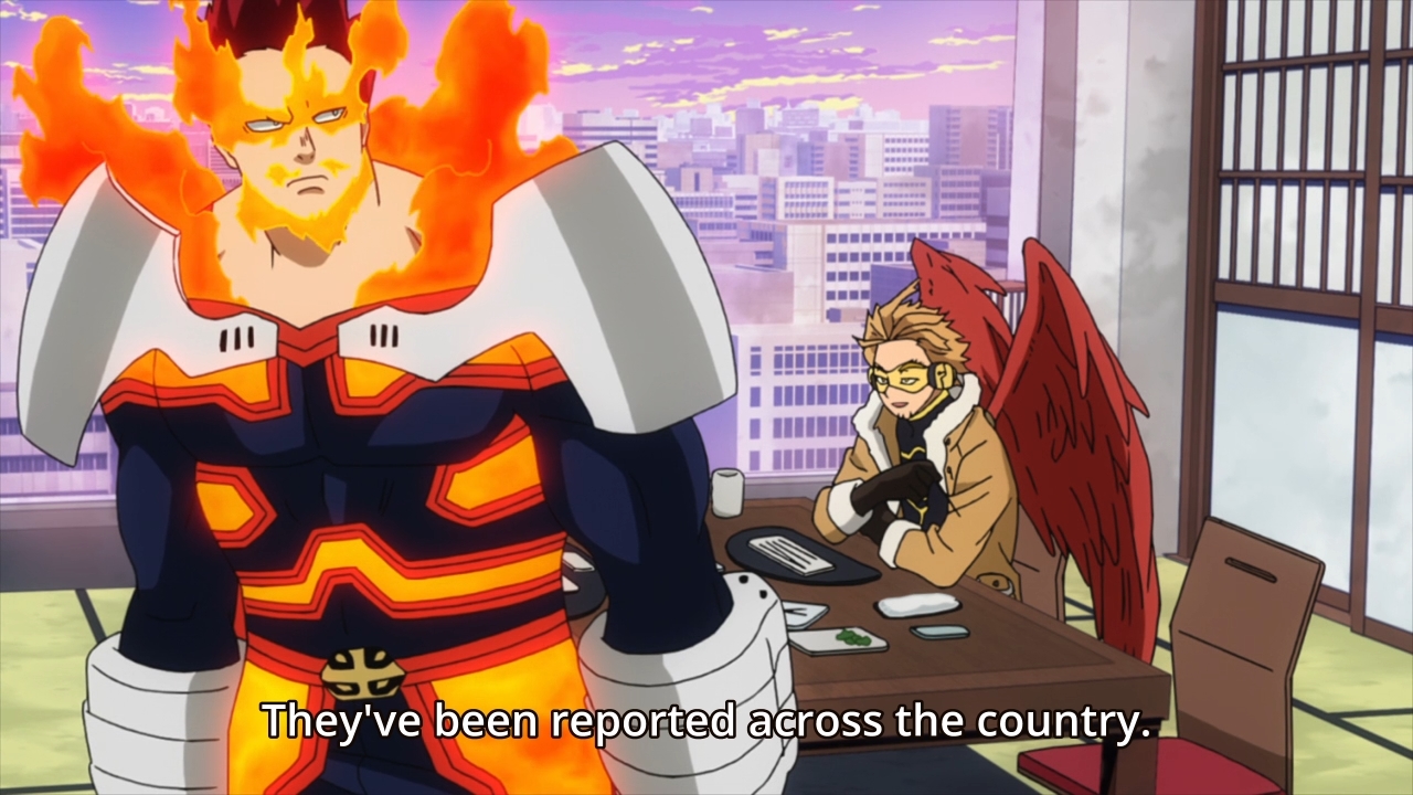 — Moving along, Hawks calls Endeavor all the way out to Kyushu to talk about some unsettling rumors. Apparently, Nomus have been sighted, and he thinks this is the golden opportunity for Endeavor to seize his newly minted ranking by quelling society’s fears.