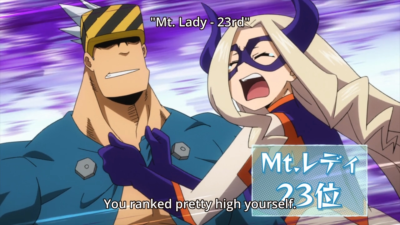 — There are apparently rumors that he and Mt. Lady are dating. Uh, like she says, no comment. I mean, a dirty joke came to mind, but this is a shounen for all ages!
