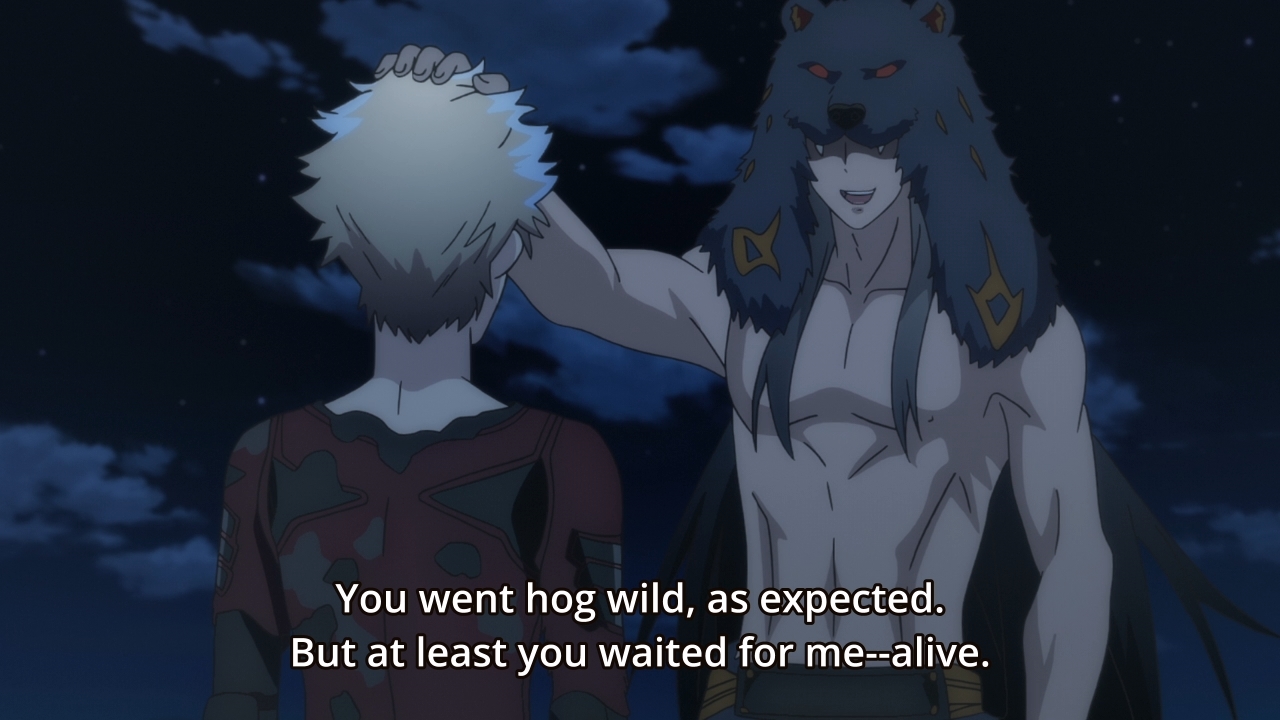 — Outside the city, Ray’s about to die to this dinosaur-looking monster when Shu shows up and head-pats his lil’ brother. All younger siblings love head-pats, I guess. Anyways, he thanks Ray for surviving this long. Again, if he could do this, why did he make his brother wait? Am I missing something? I thought there was a barrier preventing high level Masters from leaving. Did Shu punch his way out? Ah well.