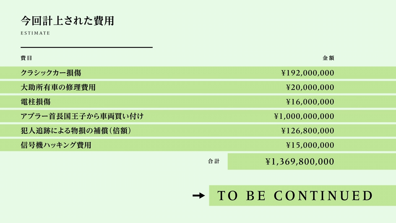 I guess every brilliant detective has to be kooky in some form or another. Daisuke goes even further and is just straight up unlikable. If you want a hero with a devil-may-care attitude, then he’s your guy. He will get the job done. He will get results. And when the captain yells, “You caught the perp, but you destroyed half of the city!” Daisuke will just throw fat stacks of cash to make the problem go away. There’s why “Balance:UNLIMITED” is in the show’s title; his bank account is impossibly bottomless. At one point in the episode, Daisuke needs to commandeer a vehicle to go after a van that contains a bomb. Instead of picking any regular car on the street, Daisuke goes for the tricked-out sports car being driven by some rich-ass foreign prince. How does our asshole detective convince the man to give up the vehicle? By proving that his pockets are even deeper and wider. Since the car costs 300 million yen, he goes and pays the foreign prince a mind-boggling one billion yen. Just moments ago, he had plowed through a street, because who cares? Money will solve everything! The end of the episode even tabulates all of the money he spent this week.