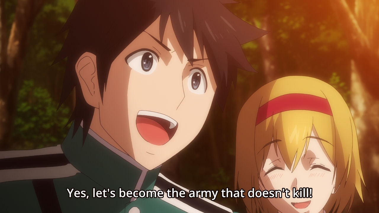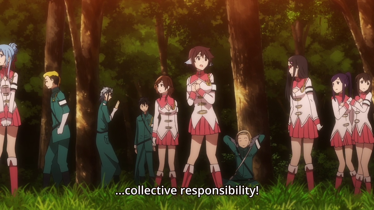 — The pervy mood is spoiled, because Licht is reminded that his classmates are taking this soldier thing seriously. Blah blah blah, they have no choice. They have to fight or they’ll starve, yadda yadda yadda. It’s just yet another classic case of anime violating the principles of “show, not tell.” We’re told over and over that the world is in a bad place, but we rarely get to see what’s going on outside the school. It’s ineffective storytelling at its best. These children are trying to make the weighty decision to become a soldier, and there’s no gravitas to this scene because exposition is often the only way that anime knows how to convey its narrative.