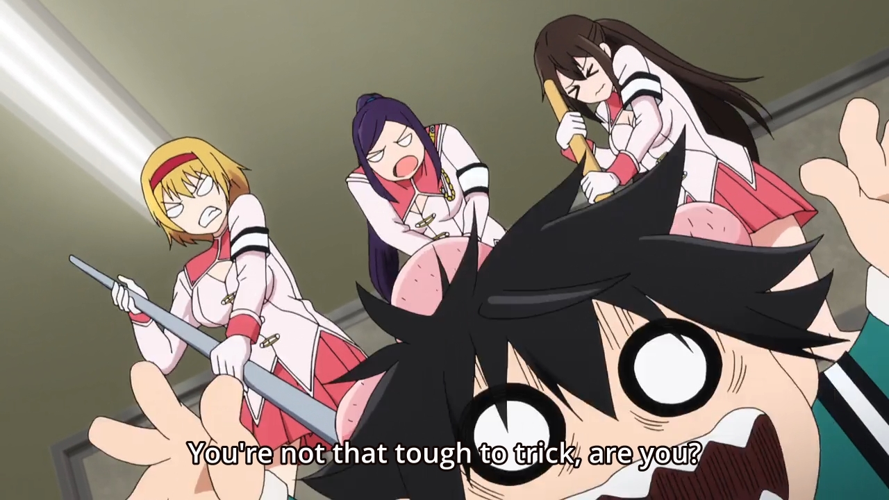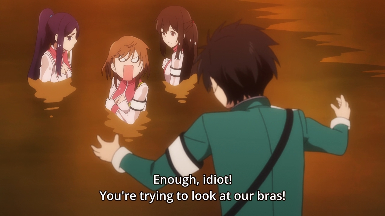 — So like I said, the start of the episode is all about Licht peeping on the girls. But for some bizarre reason, they don’t know that it’s him. Not only do they have to try and catch the perp, they have to do so soon. If they don’t, the whole class gets punished. ‘Cause that makes sense. Girls, if someone is violating you and you can’t identify them, it’s really your fault. ‘Cause, uh, it’s soldier school and soldiers gotta be strong or something like that.
