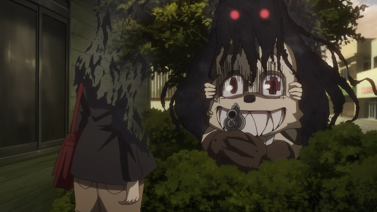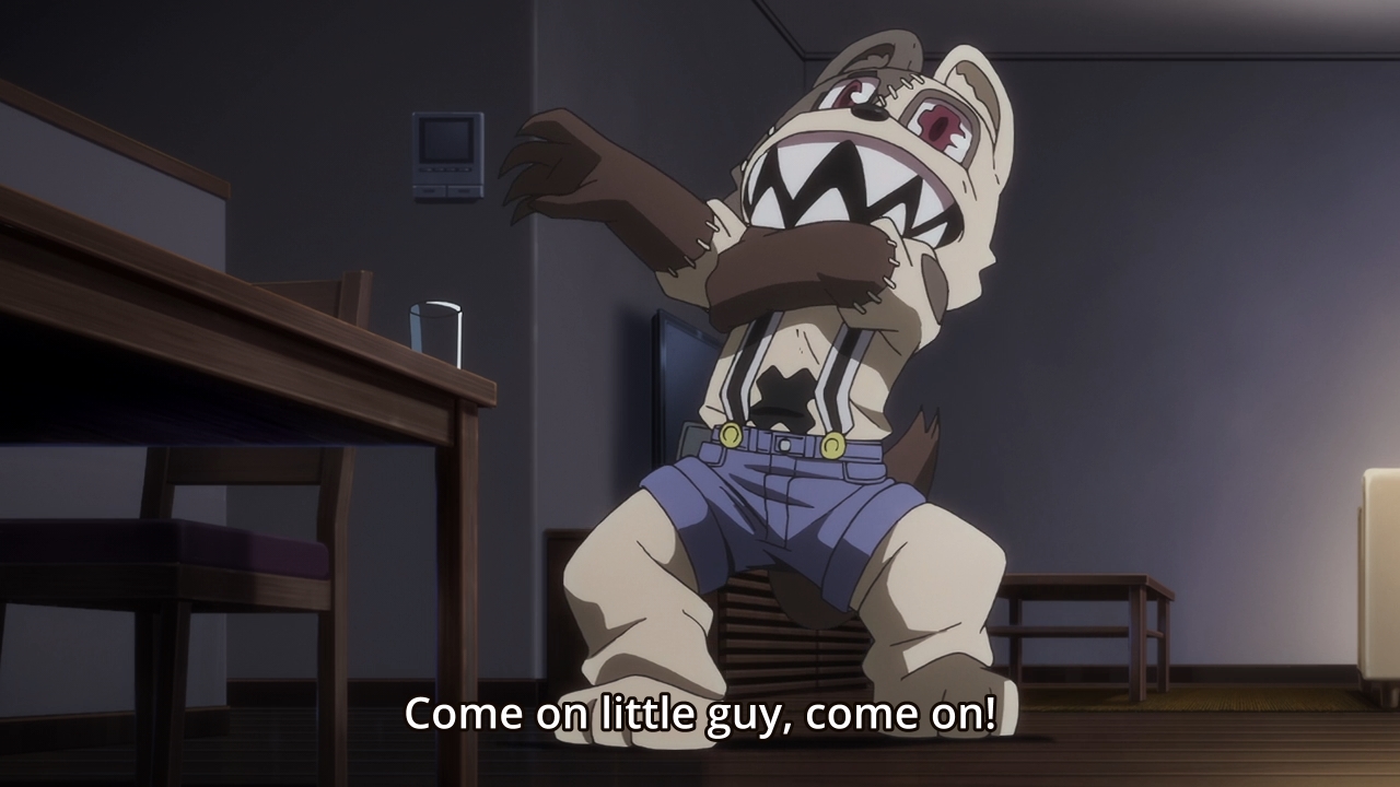 — Since Shuichi is a dog, it makes sense that he would have a keen sense of smell. As a result, Clair has him sniff his sister’s uniform in order to track her down. In the process, we get to see a photo of the two sisters, but Elena’s face is conveniently obscured. You would only do this if we’ve already seen here before. Well, she’s obviously not one of the innocent classmates that we met in the first two episodes. As a result, I can only imagine that she’s the girl at the end of last week’s episode. Y’know, the one who made a wish to turn Shuichi into a monster.
