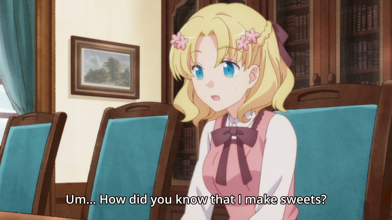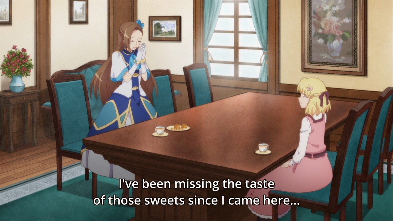 — Eventually, Catarina bumps into Maria herself, and they have a pleasant enough conversation. Catarina even accidentally lets it slip that she knows all about Maria’s talent for baking sweets. It’s amazing how someone like our heroine can stay so slim even though she stuffs herself silly with sugar. Maybe that’s Catarina’s true talent. Just earlier in the episode, she was complaining about how she doesn’t seem to be too good at this spellcasting stuff. Maybe her true talent lies in turning all those calories into nothing.