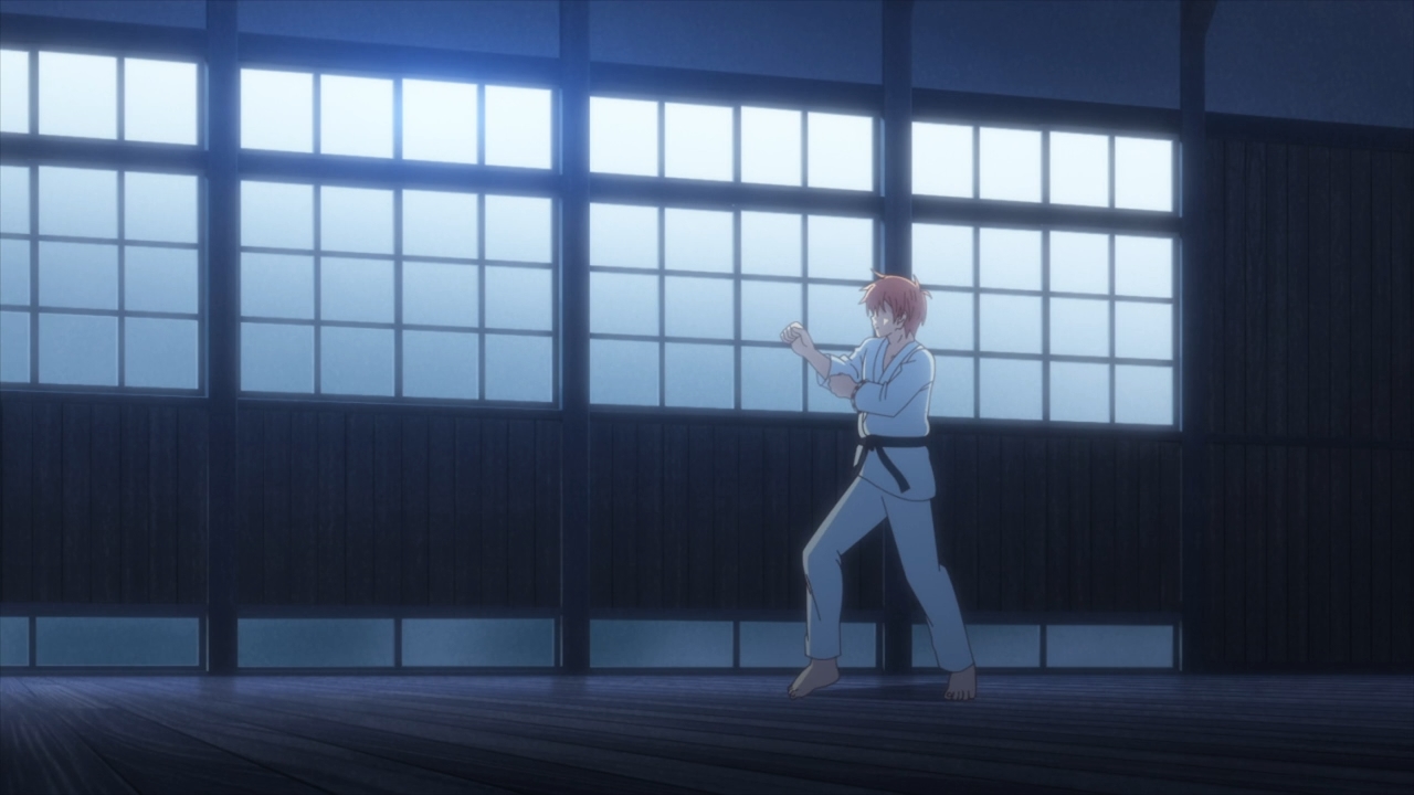 — But Kyo is also practicing his moves at the dojo. Metaphor for him working hard as well? Or maybe he’s also got frustrations to let out. Eh.
