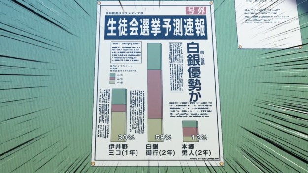 — At the same time, however, it would be boring if Miyuki simply crushes the competition. Either Chika somehow helps the underdog make up some major ground (unlikely), or Miyuki shoots himself in the foot to make the election much closer than it needs to be. We’ll just have to wait and see, I guess. You can bet the house, however, that he’s not going to lose. I’m not sure I can really imagine this show without him and Kaguya at the top of the student council.