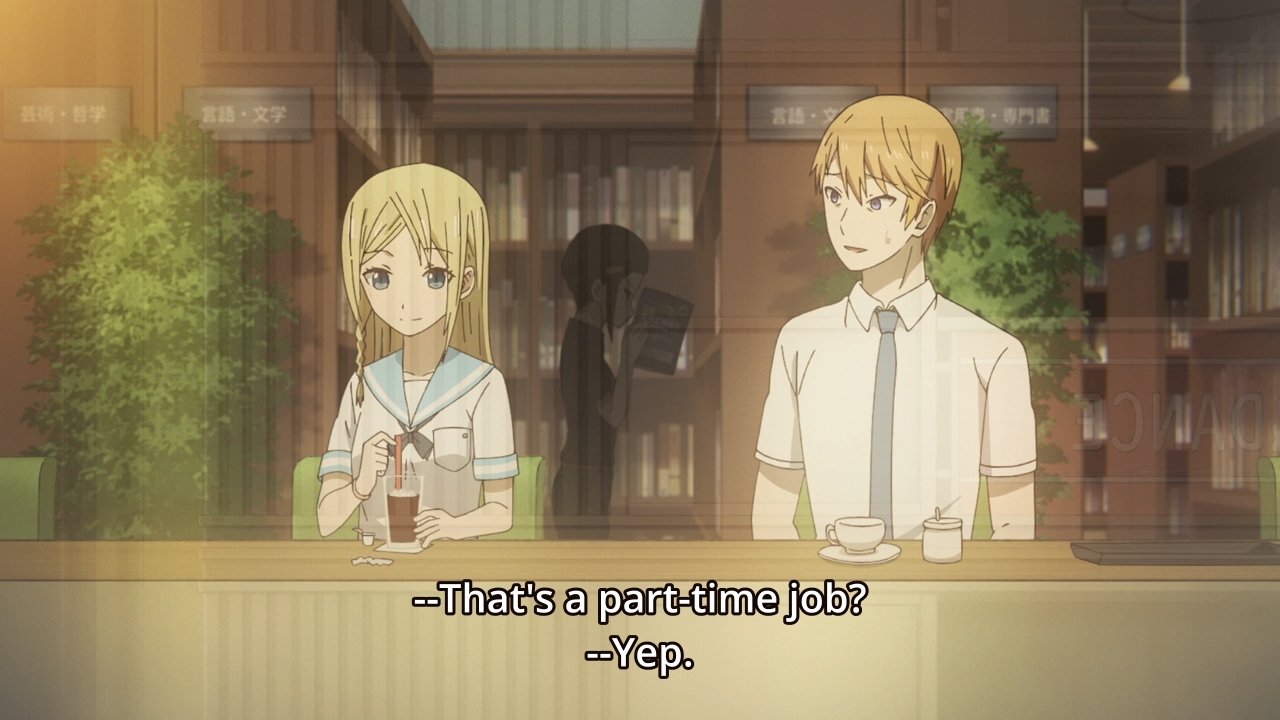 — Ai is so dedicated to her job that she would even pretend to sleep for three hours. And somewhat similarly, Miyuki is such a nice guy that he doesn’t leave her side. Apparently, girls are completely defenseless in a Tokyo bookstore. Shrug.