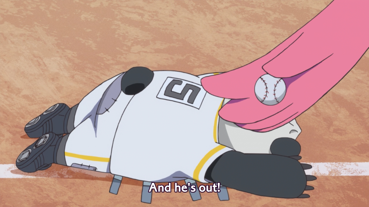 — Michiru initially doesn’t want to join the team, but after the Bears send her on a guilt trip, she finally relents. She has one rule, though: no killing. So the opposing teams can kill them, but they have to be clean! Obviously, baseball in Anima City just isn’t worth it. It’s a game where you can literally die, but you barely get paid for it. What dream is worth your life?