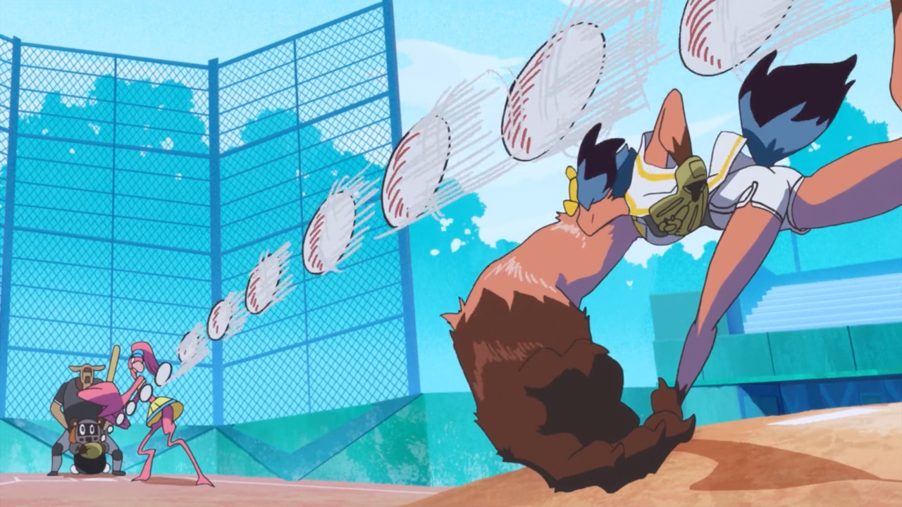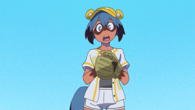 — Michiru prefers basketball, but with all her superpowers, she ends up excelling at baseball. She’s got gorilla arms for pitching and batting, cheetah legs for running the bases, and super stretchy arms for catching fly balls. The first two are at least animal-related. I’m not exactly sure which species on this planet can mimic Stretch Armstrong. In any case, it’s obvious that Michiru isn’t just a tanuki. She’s got all sorts of animal DNA in her.