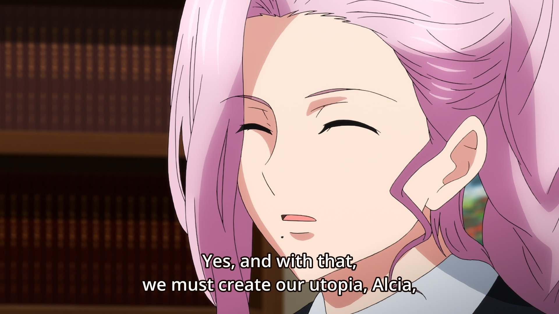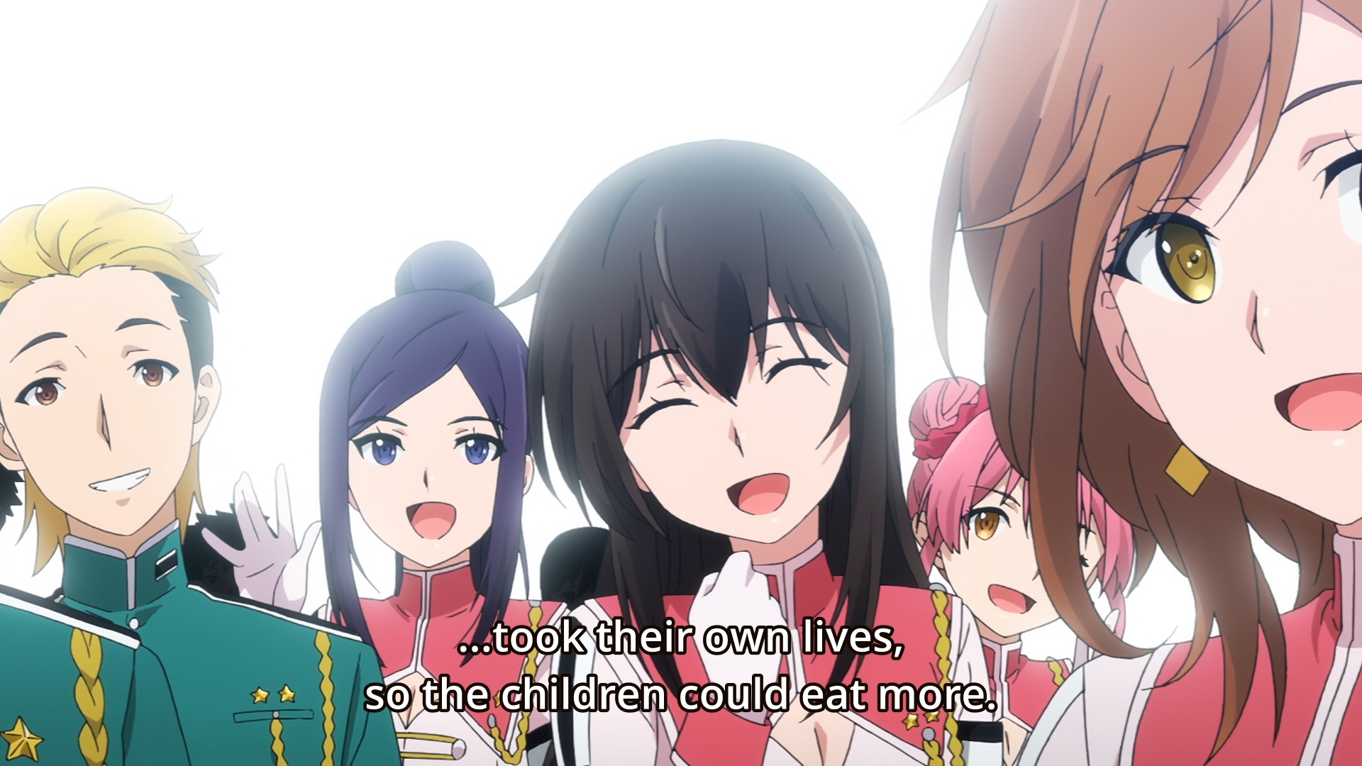 — Anyways, Licht either falls asleep or goes into a coma for a really long time. When he wakes up, he learns that the rest of Class A had tried to save all of the orphans, but they eventually decided to kill themselves in order to be less of a resource drain. Alright. At this point, I feel like the writer is just trying to score as many tragedy points as possible. No one tries to do anything constructive. No one tries to solve the food shortage issue. No one tries to stop three adults from creating Alcia and thus draining the world of its resources. No one actually tries to solve anything. They just kinda fuck around until it’s too late, then they die so that we can feel sad.