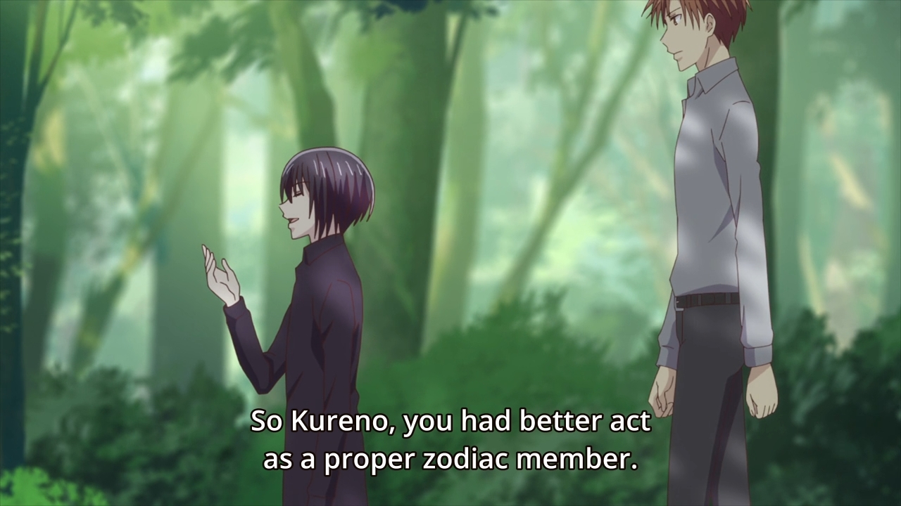 — The next morning, Akito plans to take Kureno with her to go see Tohru. She goes on and on about how she’s gonna put our heroine in her place. She also alludes to the fact that Kureno is a broken Zodiac. After all, he embraced Arisa without any issues, so his curse is already broken.