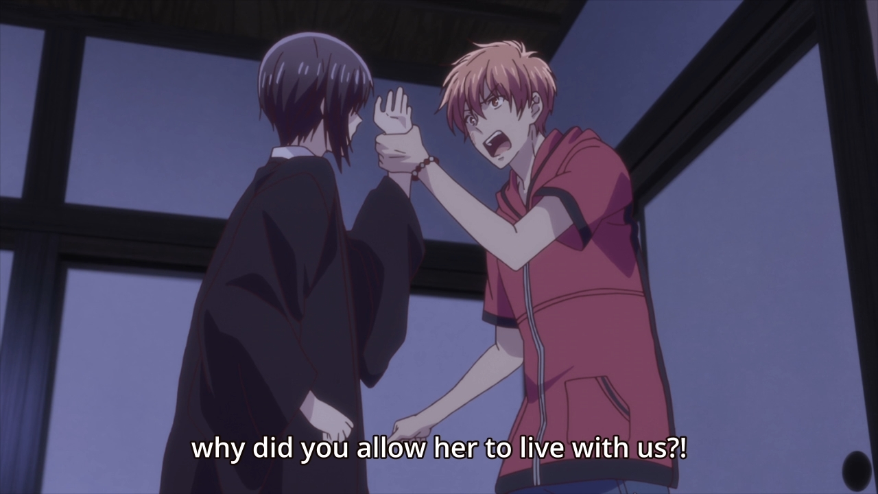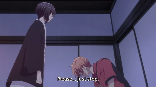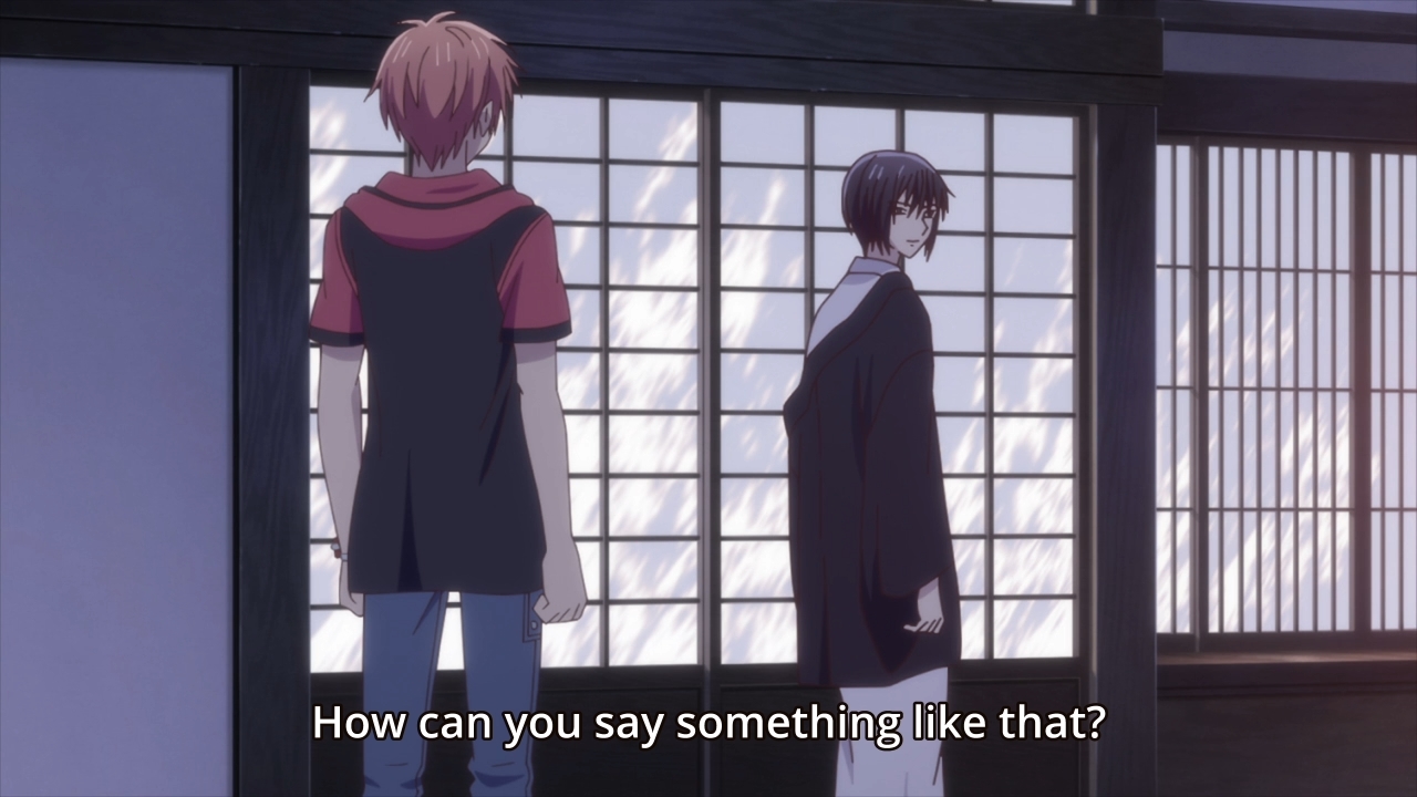 — When Tohru hears that Akito has summoned Kyo, she is excited for him. She’s so optimistic that she can’t even imagine that the Sohmas have been taking nothing but Akito’s abuse for the past few days. Kyo is just the next victim in line. Hm, I guess you can’t really fault someone for always trying to see the silver lining in every situation, but this is an example of how unchecked optimism can actually hurt someone. Kyo isn’t affected, but I can imagine someone else in his shoes feeling as though Tohru doesn’t really understand their feelings. ‘Cause who knows, maybe Kyo is actually doing a good job at hiding his emotions, but from my perspective, he clearly isn’t happy to be summoned. If anything, he’s confused and perhaps even a bit disturbed. Tohru doesn’t see that, though. So again, either we are allowed to see what she can’t see, or she’s not as perceptive as she could be.