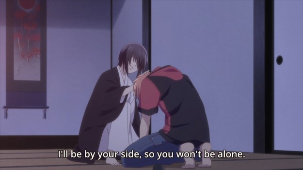 — When Kyo finally gets to go back to the main vacation house, he finds himself looking for Tohru. After suffering Akito’s abuse, he yearns for her unconditional love and acceptance. When he was younger, he thought he had truly given up on love. He thought there would be no way out of his despair, but his master told him otherwise. Kazuma reassures the kid that hope can never be extinguished. After meeting Tohru, Kyo finally understands what his master had tried to tell him… kinda.