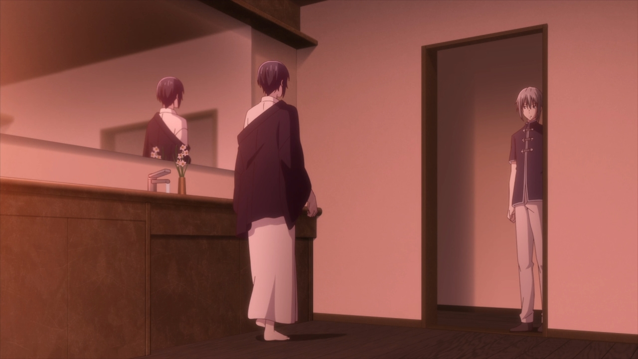 — Once again, Yuki warns Kyo not to cause any trouble. And after Kyo is no longer within hearing range, the rat goes, “He needs to know his place. Him and me both.” Does he have any ounce of sympathy for the cat? Any guilt over the fact that one of his own family members will be locked up for the rest of his life? I can’t really tell. To be fair, Kyo wants the rat to be locked up instead, so I guess everyone needs to look past themselves. Unfortunately, they can do it for Tohru, but not each other.