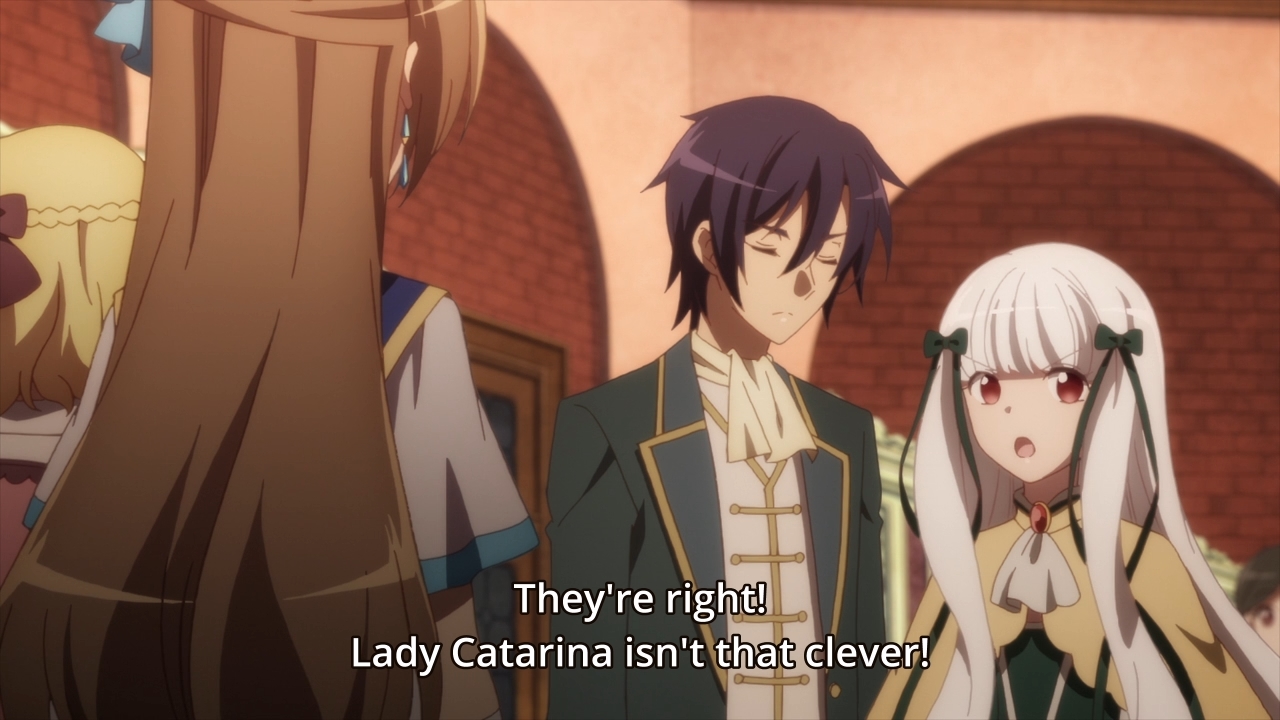 — The mean girls try to accuse Catarina of bullying Maria, which is patently untrue. Nevertheless, our heroine believes that she has somehow triggered her doom flag. She actually thinks there’s a chance that Maria might agree with her accusers. It never once occurs to her that her friends would come to her defense, which is exactly what they do. Obviously, it has been well established that she isn’t very bright.